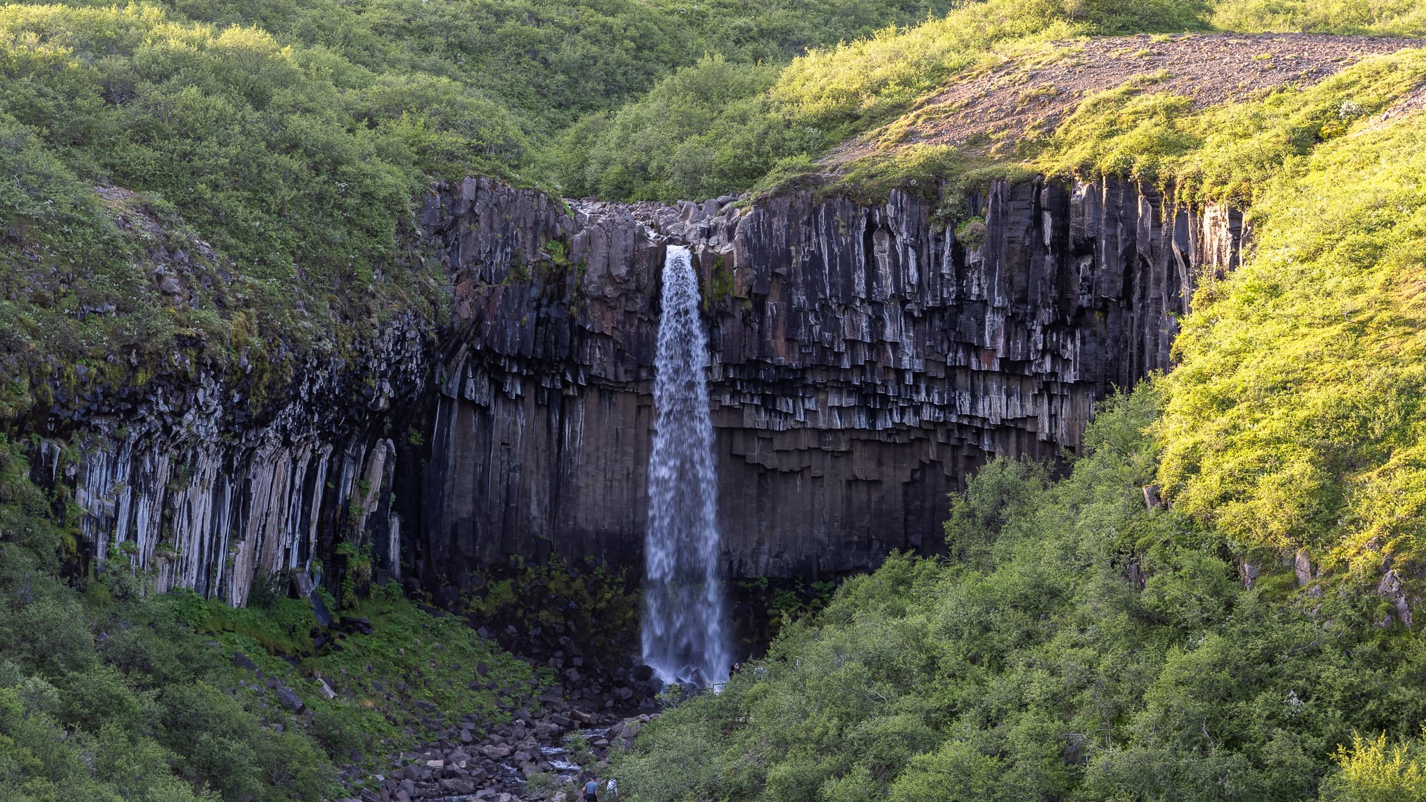 下一站是瓦特那冰原西侧的柱状玄武岩瀑布Svartifoss。这里大概是全冰岛最popular的户外运动区,Trailhead下面就是巨大的房车营地, 我们到时大部分人已经住下,营地里时不时飘来烧烤的香味,眼泪不争气地从嘴角流了下来。除了Svartifoss这个大概一公里的短徒步外,这里还可以走到冰原西侧的冰川脚下——不过冰川我们见得太多了,这次时间有限也就跳过了。