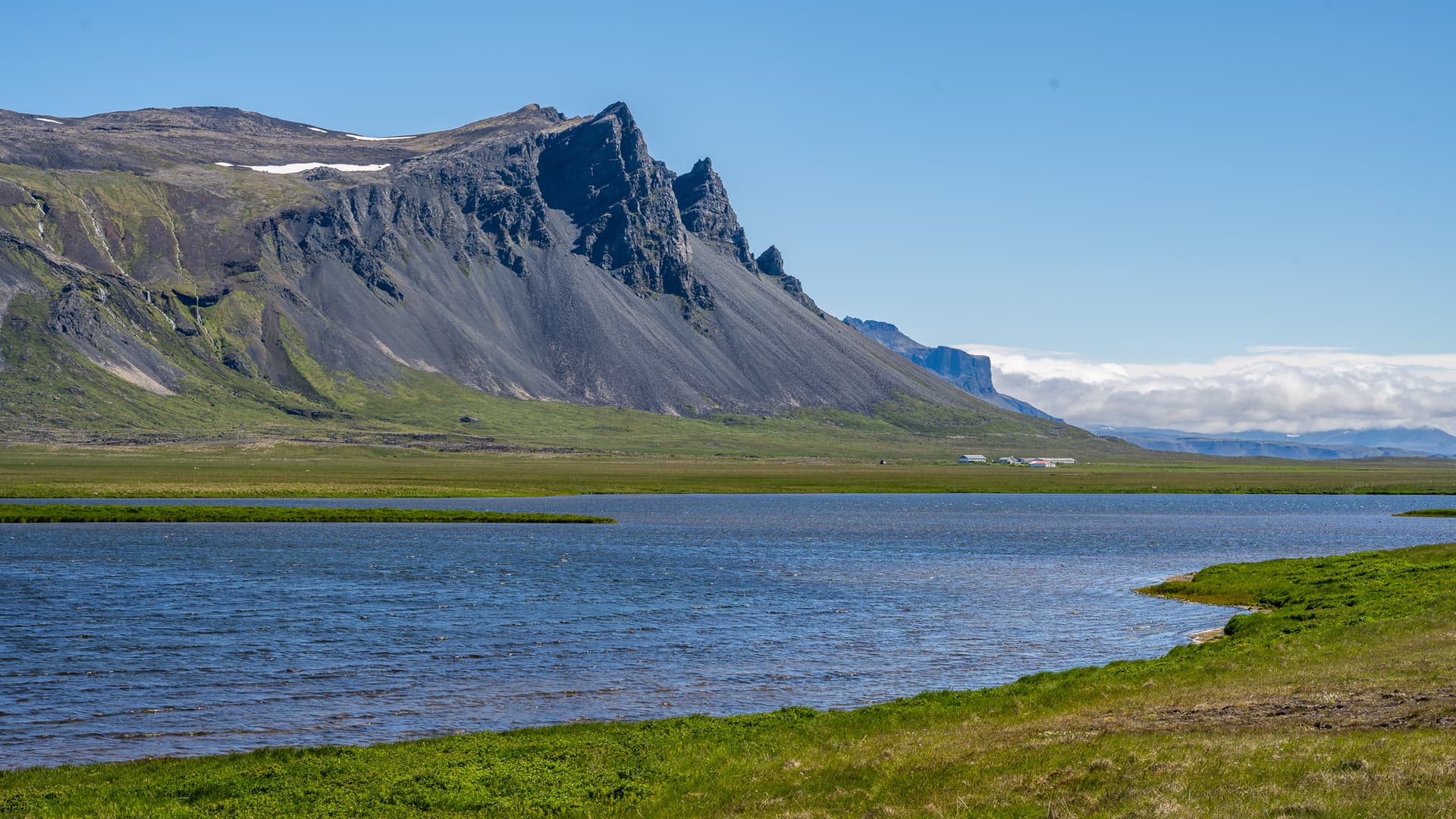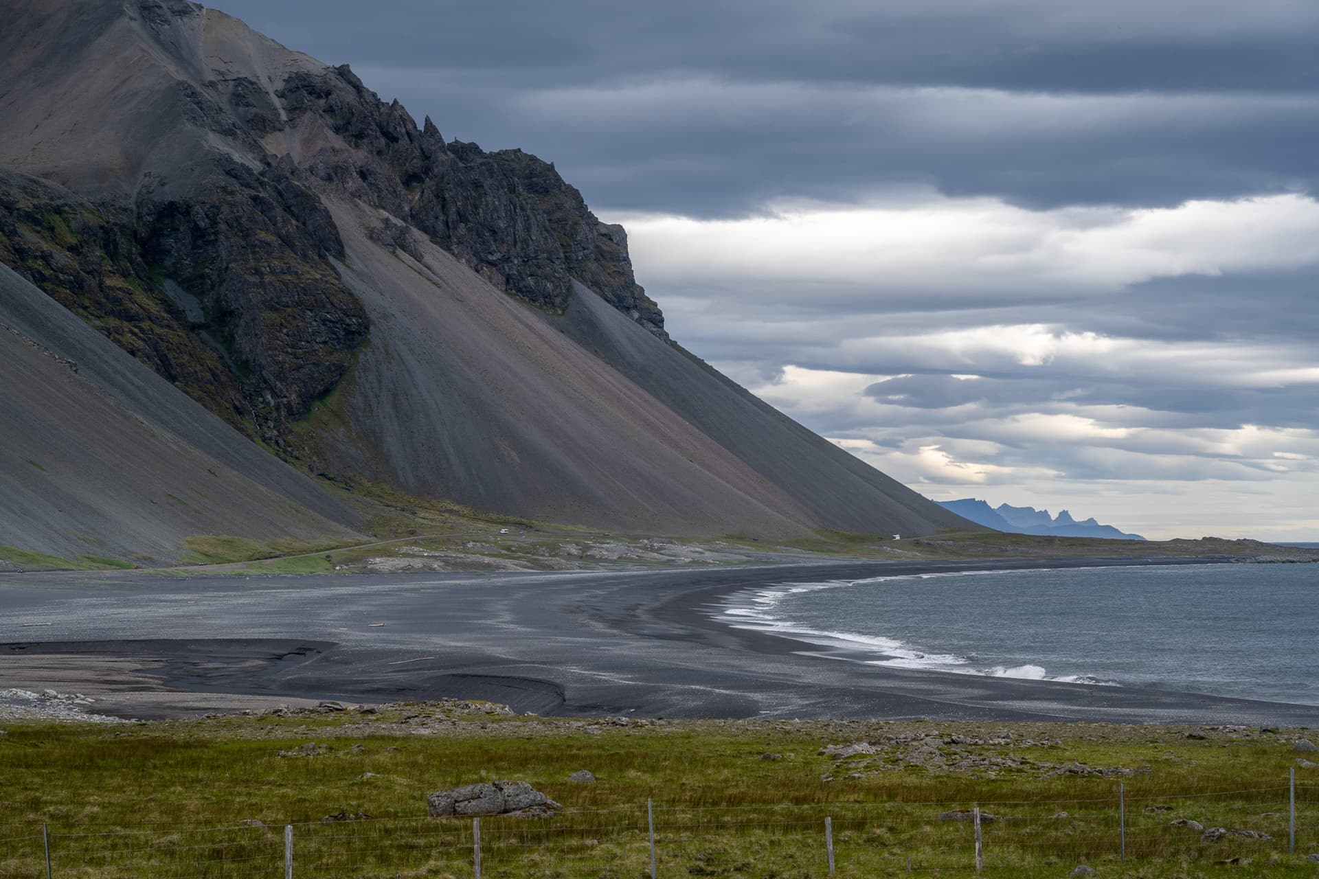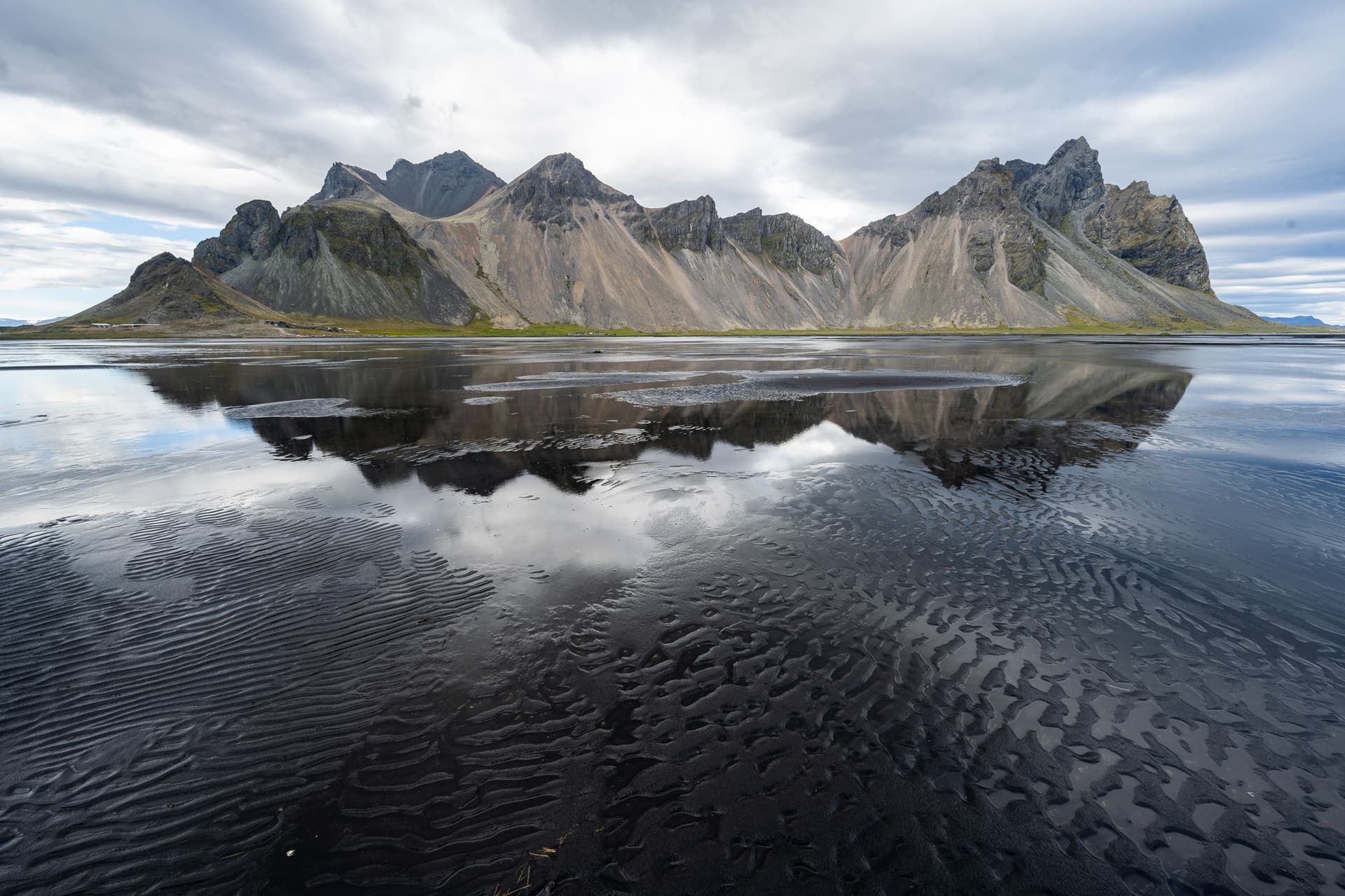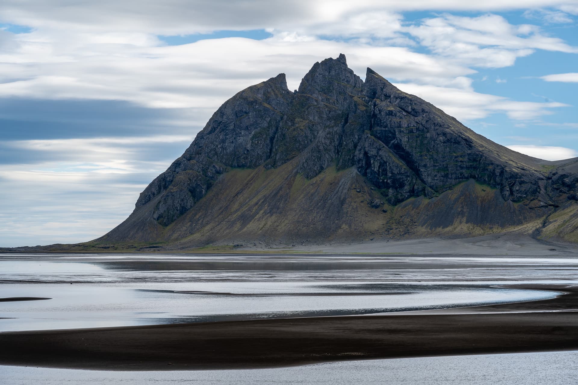 东南峡湾区最上镜的景点是俗称为“蝙蝠山”的Vestrahorn。这座山从西侧和东侧去看各有特点,东侧的山尖仿佛蝙蝠十分上镜,而西侧有个景点叫Viking Village内可从黑沙滩上去看整座山的全景,黑沙滩的反射倒影十分魔幻。