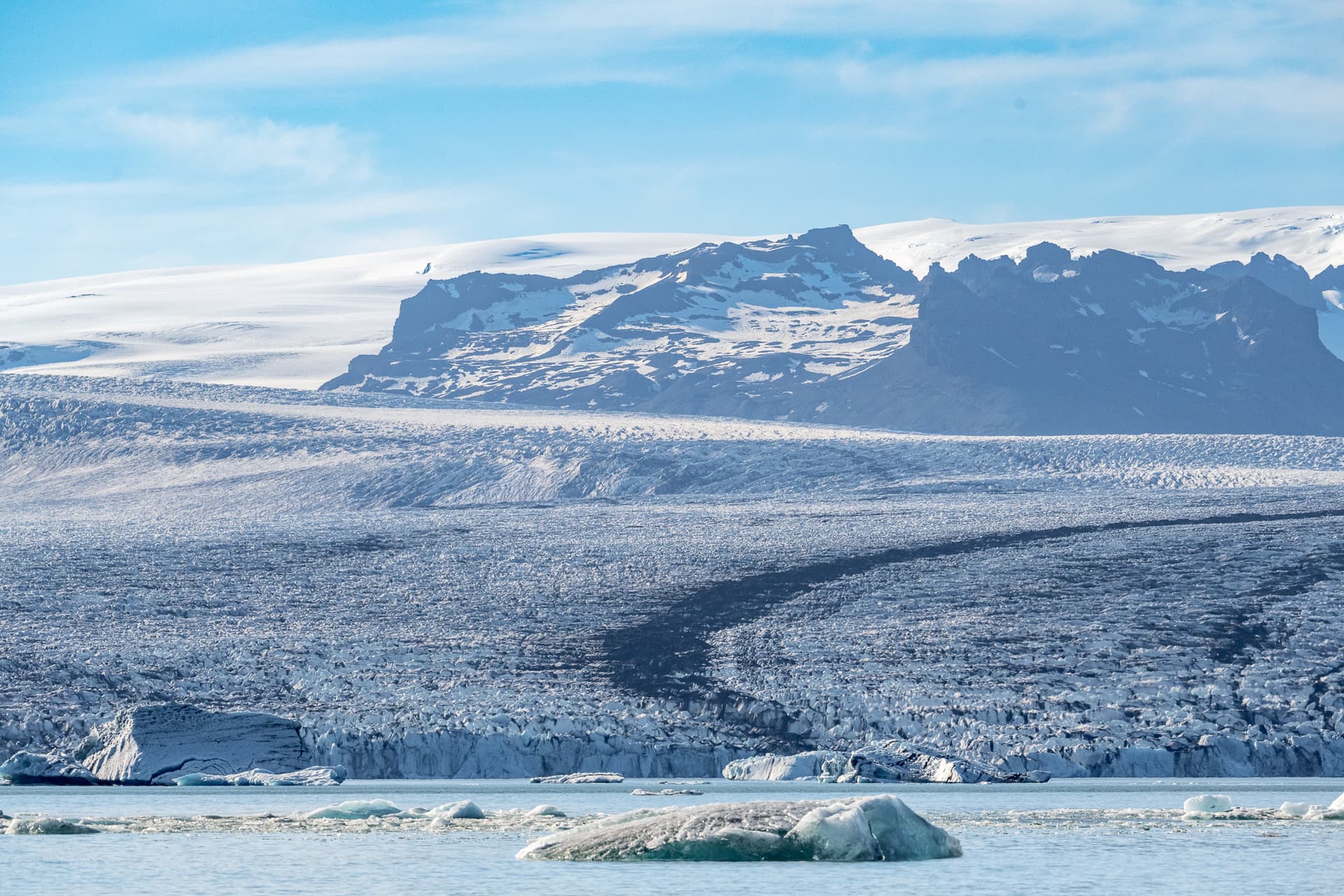 经过蝙蝠山就到了欧洲最大冰原瓦特那冰原(Vatnajokull)的南侧,各种各样的冰舌形态各异,虽然走过阿拉斯加几乎全部的可游览冰川我自称“冰川专家”,但这种冰舌直接延伸到绿草地中的场景我也是第一次见。