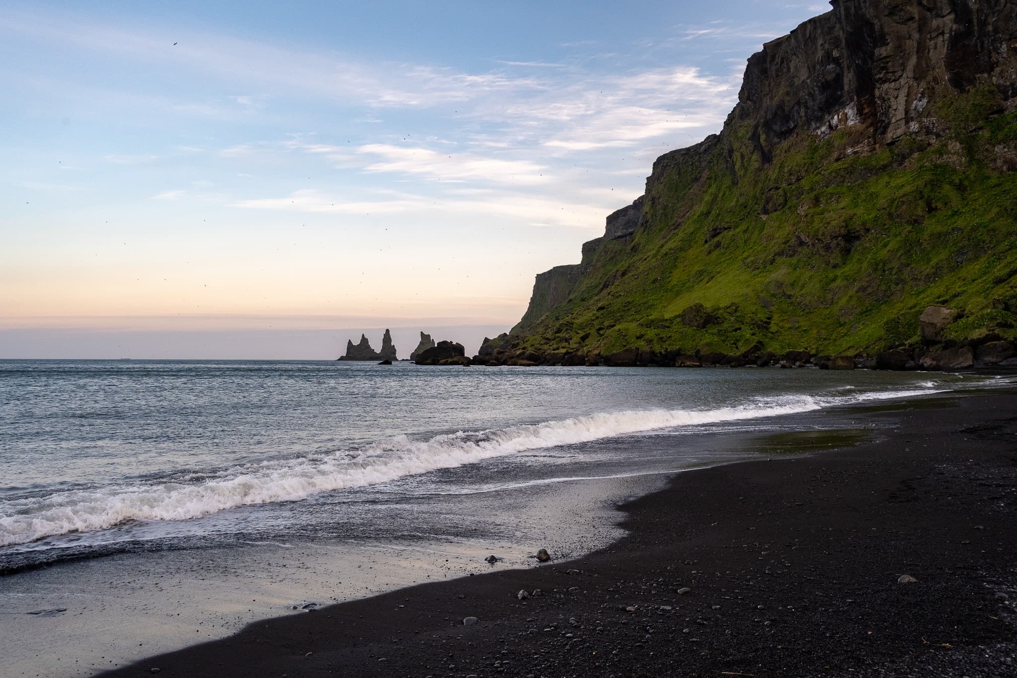 Reynisfjara黑沙滩大概是冰岛打卡的名片,也是臭名昭著的不会看海浪预报和沙滩门口警示的国内巨婴被卷走的地方。我们去的那天风平浪静,抵达时光线已经非常柔和。我们先去到了黑沙滩的东侧,比起西侧的人从众这里比较小众,风景也颇有可圈可点之处。