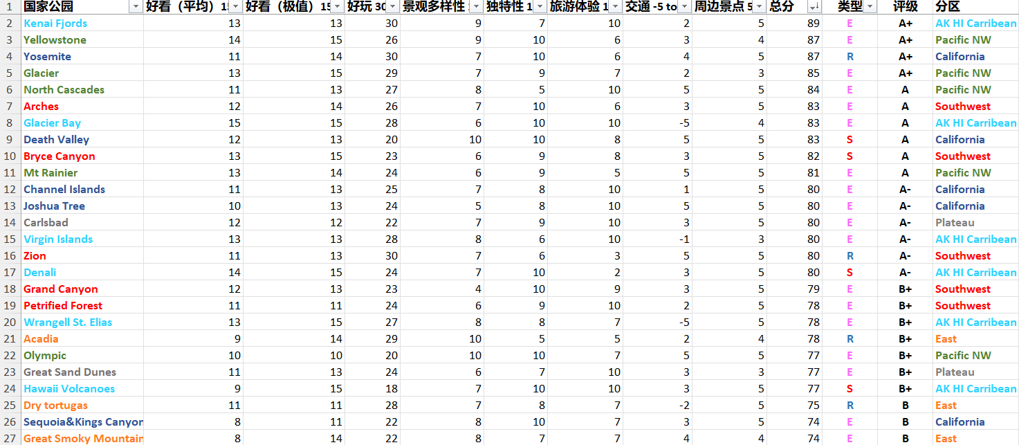 )。至于权重,我是尽量按照一个中国游客的标准去设置的。前一阵某个美式排名把Isle Royale排在了第一位,原因是人少营地好体验好,我只能呵呵呵,一看就是典型的美式说辞之“每个地方都很美没有高下”,which真的是笑笑就行了