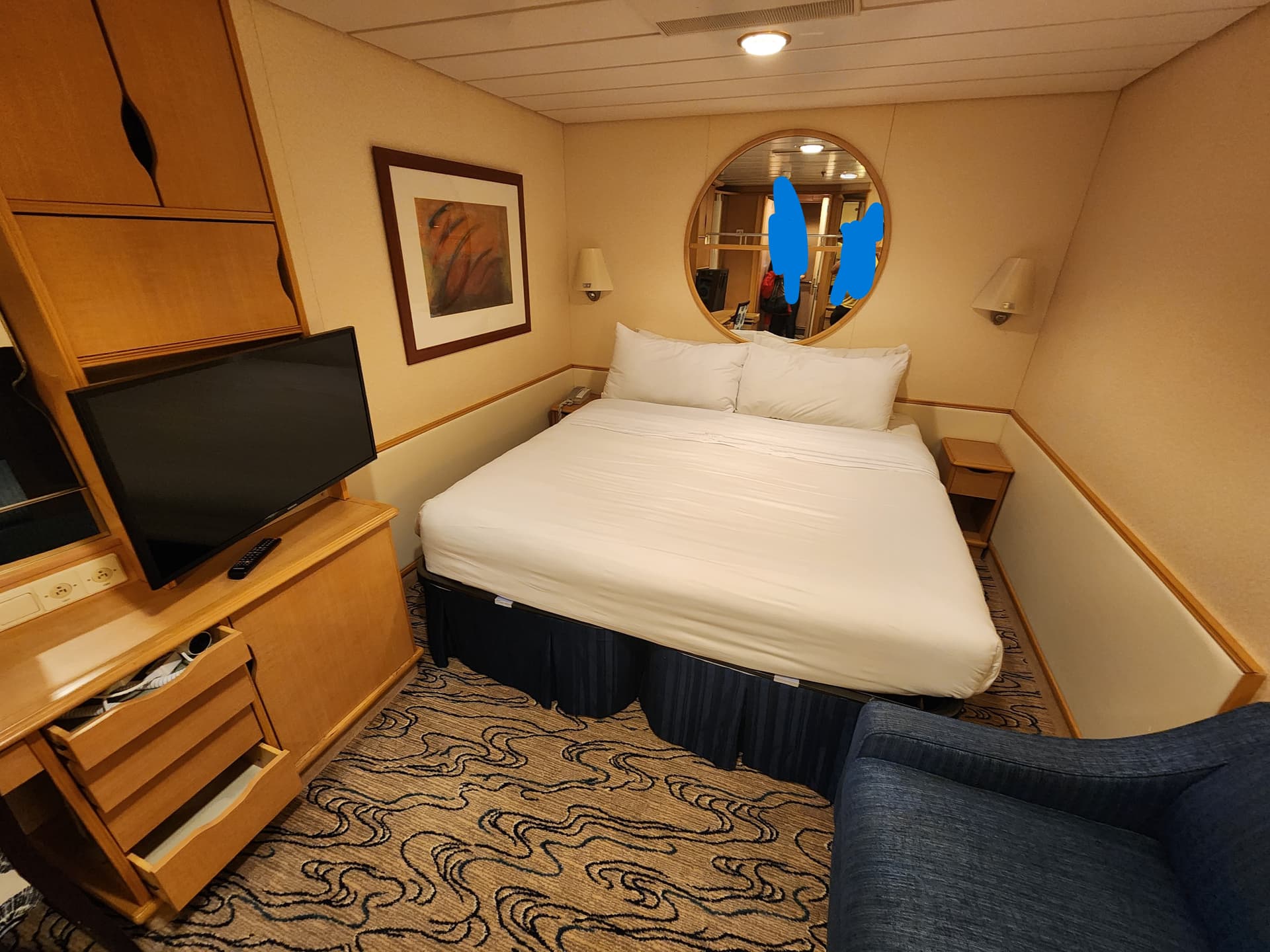 由于我们是挂壁出行,订到了估计是全邮轮最便宜的一张票,客舱也自然是内舱。不过既然加勒比线本身没什么风景,这种“重重包围”下的内舱反而是体验最好的,尤其对于年轻人较多比较“闹腾”的皇家加勒比更是如此。1100块钱包吃包住7晚上,你还要啥自行车啊……