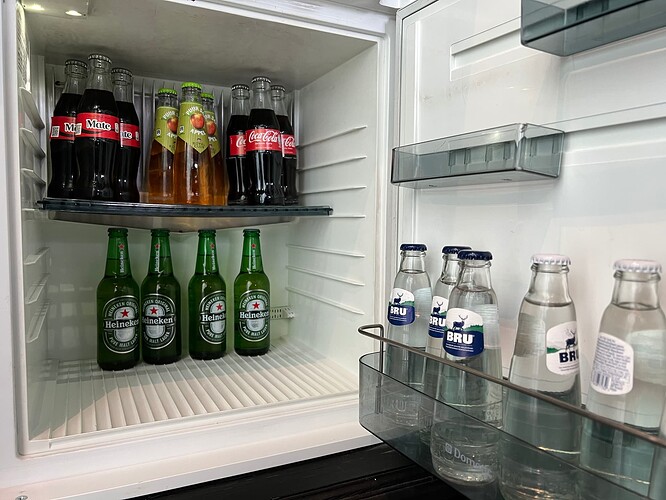 Mini-bar很大方,应该是欧洲Andaz给得最多的一家,每天我连啤酒都喝不完;然后还有一些薯片和当地特色的玫瑰糖(中上层的罐子),都很好吃