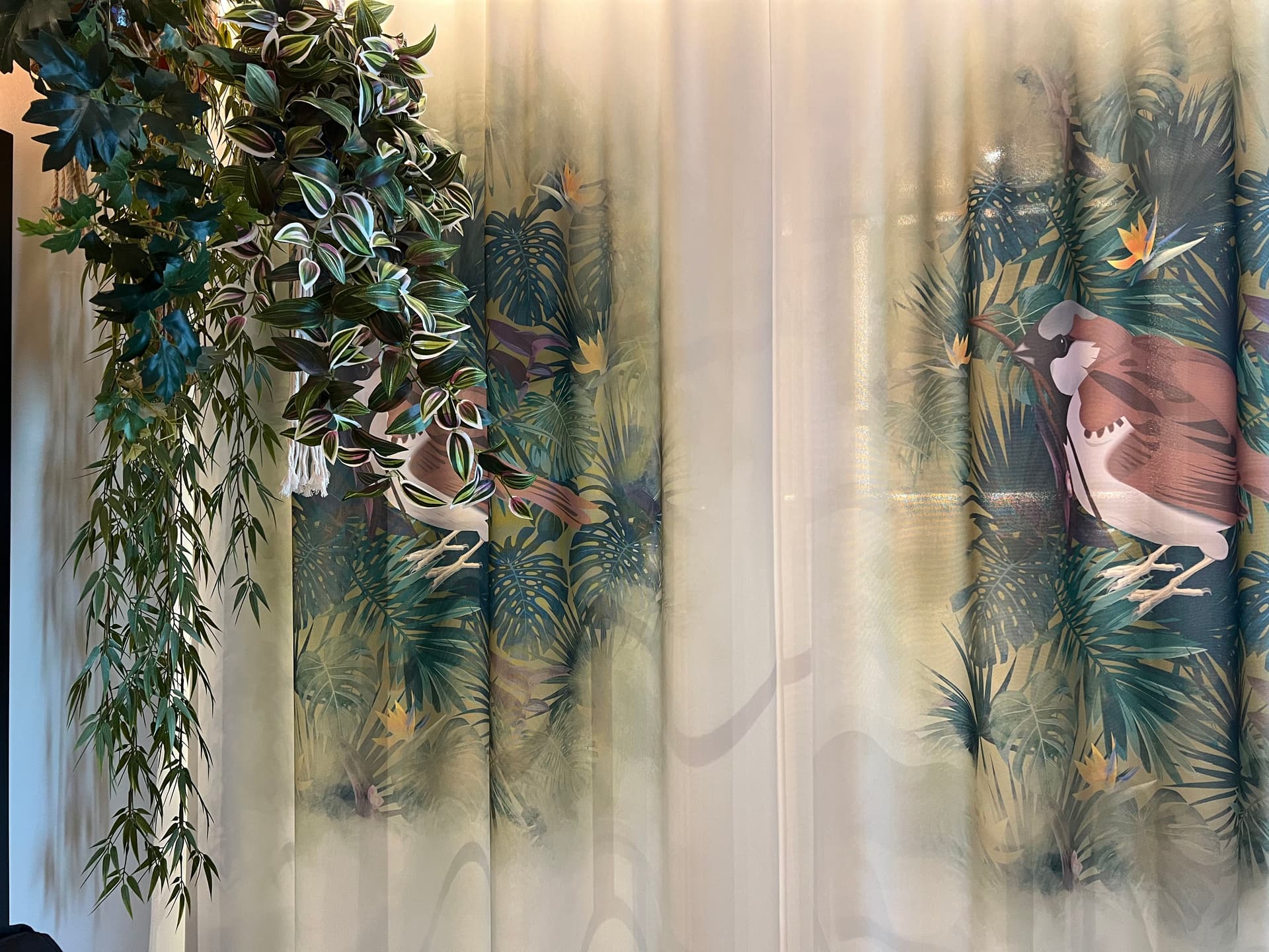 洗漱间和卧室靠这个窗帘隔开,本来应该是吐槽空间逼仄,但是这个假花和窗帘的设计反而把缺点变成优点,后面淋浴的水声也可以尽情想象成森林溪水声。