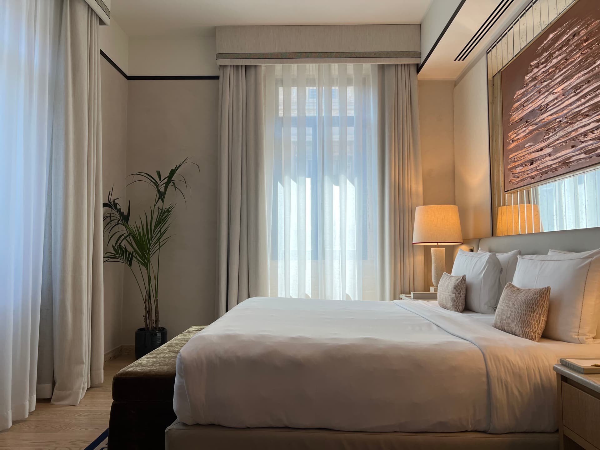 这家C6,旺季29k用起来还是有点心痛的,叠加套房券能稍微舒服一些,但是我猜测普通客房的面积应该足够了。我圣诞假期去住的,虽然app能看到ocean view套房,但是前台以房满为由没有继续升级。除此之外,酒店人员的服务态度是非常棒的,是三家UAE酒店里最好的一家,圣诞当天还送了一个姜饼屋和一盒Kunafa巧克力。酒店公共区域很漂亮,海滩区域也打理得很好,相比之下客房是真拿不出手,除了面积大没有任何亮点。房间既不是老钱风,也没有什么精细的细节,应该是我住过的最名不副实的Park Hyatt了。不过房间里还是送了一个电源转接头,这点很符合PH的水准。