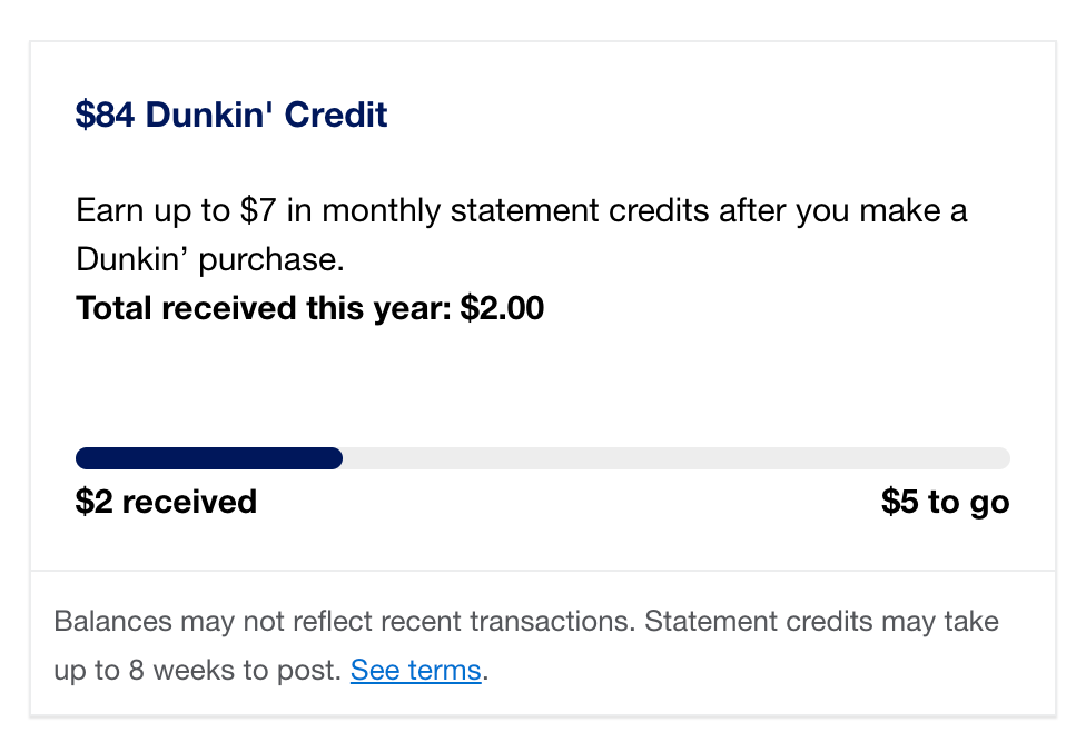 Enrolled Basic Card Members can earn up to $7 in statement credits per month when the Card or Additional Cards on the enrolled Account are used to pay for eligible Dunkin’ purchases.
