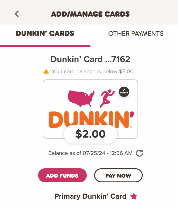 找回了9年没用的Dunkin账号 发现有一张Dunkin’s Card可以充值(估计是当年留下的),2刀起步买不了吃亏买不了上当,先试试水贡献一个DP