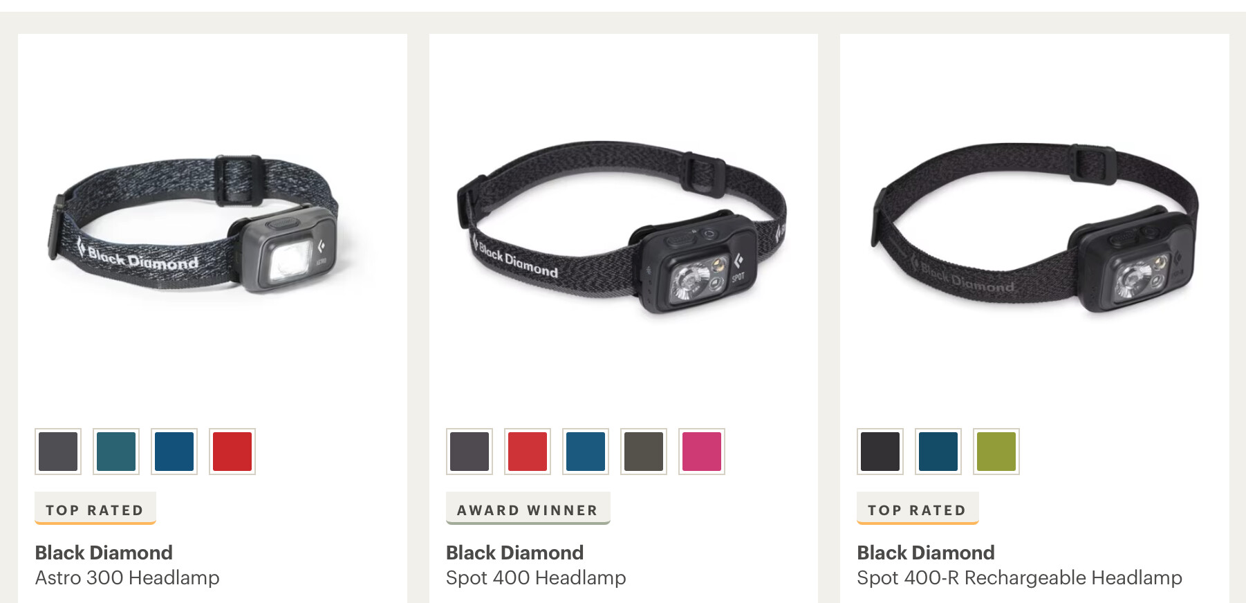 R是recharge可以重複充電形式的,但BD本身的充電頭還是micro-usb 沒有type-c 所以我最後選了400亮度的,需要裝3個AAA電池。可以搭配eneloop pro的充電電池,這樣也是可以充電的。通常2-3天的露營,3個AAA電池大概用掉1/3的電量。頭燈有很多牌子,建議選喜歡看的順眼的就好,短時間的露營應該是大同小異,不會差太多。 -