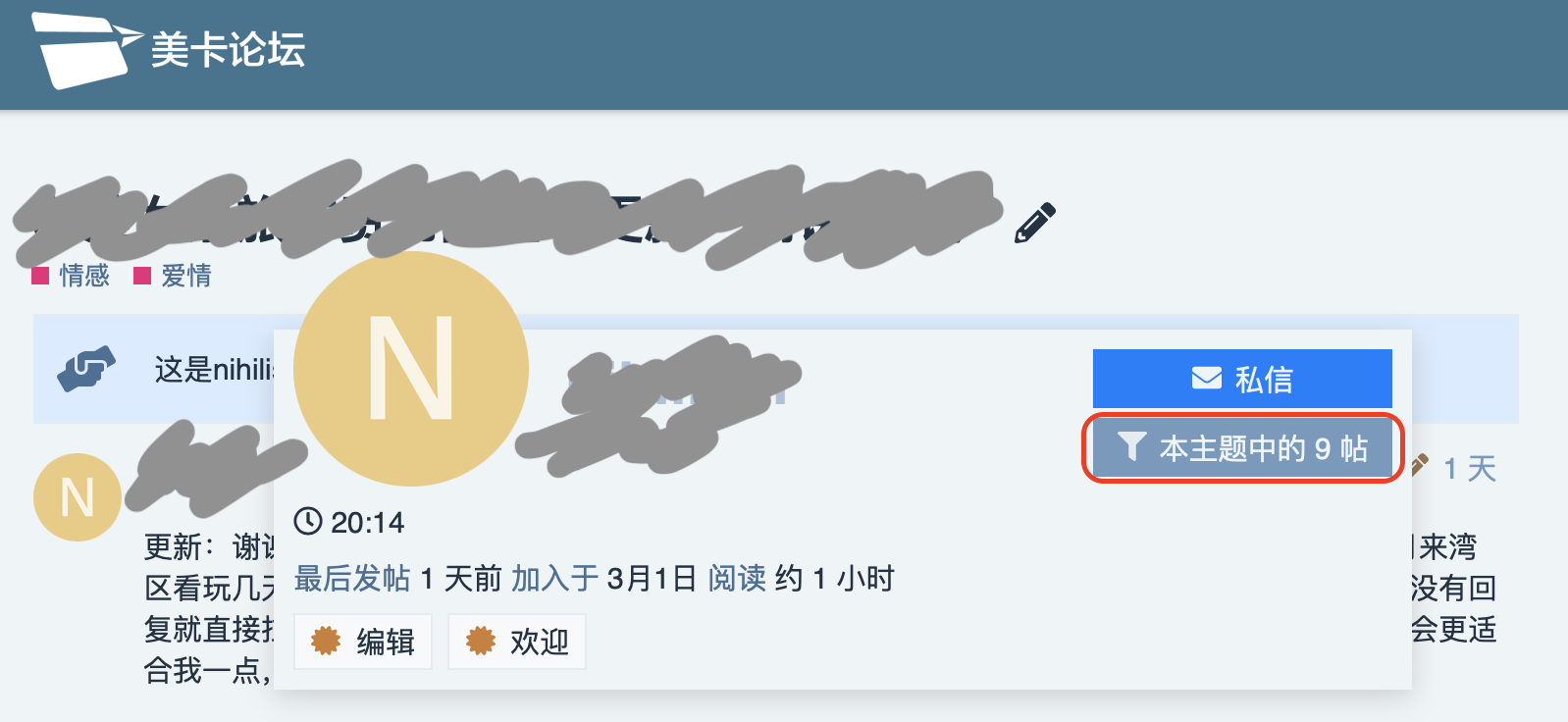 前几天有朋友问我这个论坛如何只看楼主的回复,我当时还不知道我们用的这个平台Discourse有这个功能。今天才发现怎么操作,步骤是点击帖子里一个用户的用户名,然后点击“本主题中的N帖”即可,如图: