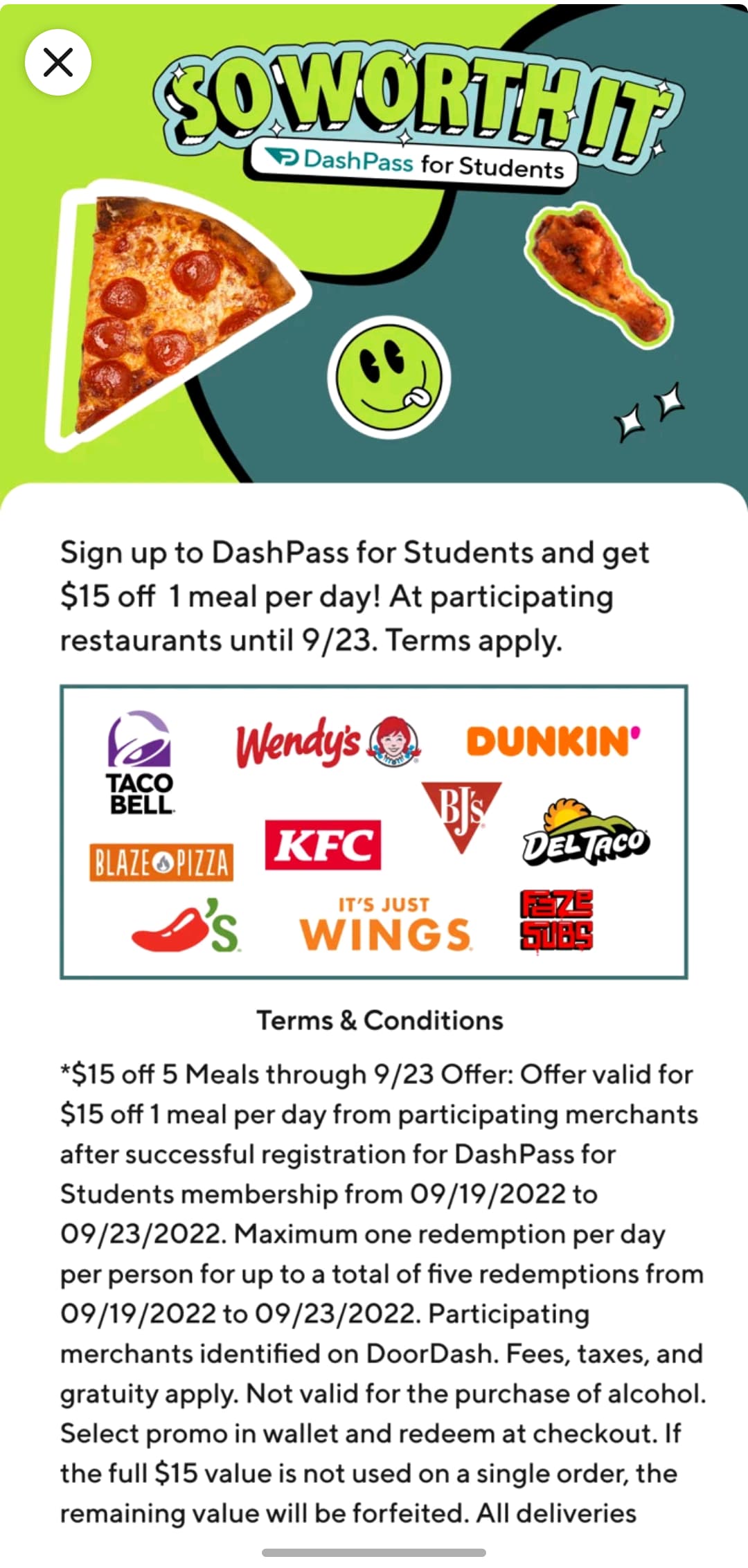 Sign up to DashPass for Students and get $15 off 1 meal per day