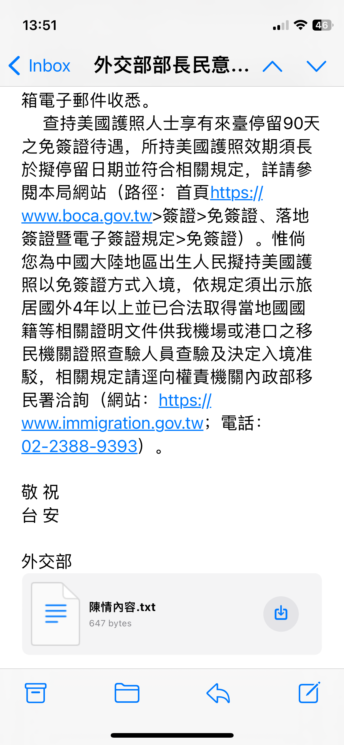 服务再好,如果官方说一套、执行又是另外一套,那有个屁用啊。你的邮件里台湾外交部说,只需要在海外旅居4年,取得当地国籍即可。但是楼主和其他很多人遇到的情况是,在入境的时候被要求已经入外籍4年。这可是完全不一样的概念。法治的国家和地区必须根据法律的字面意思来执行,而不是随意诠释,随意执行。