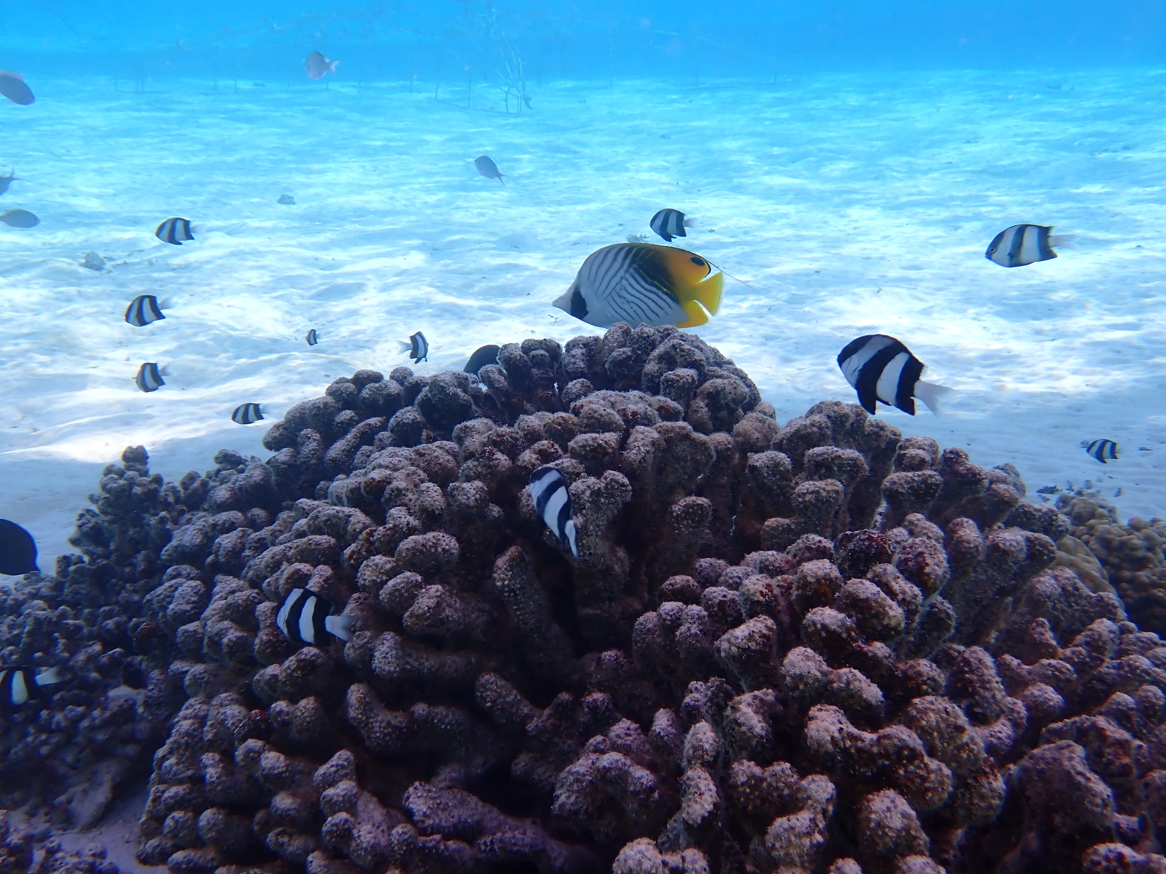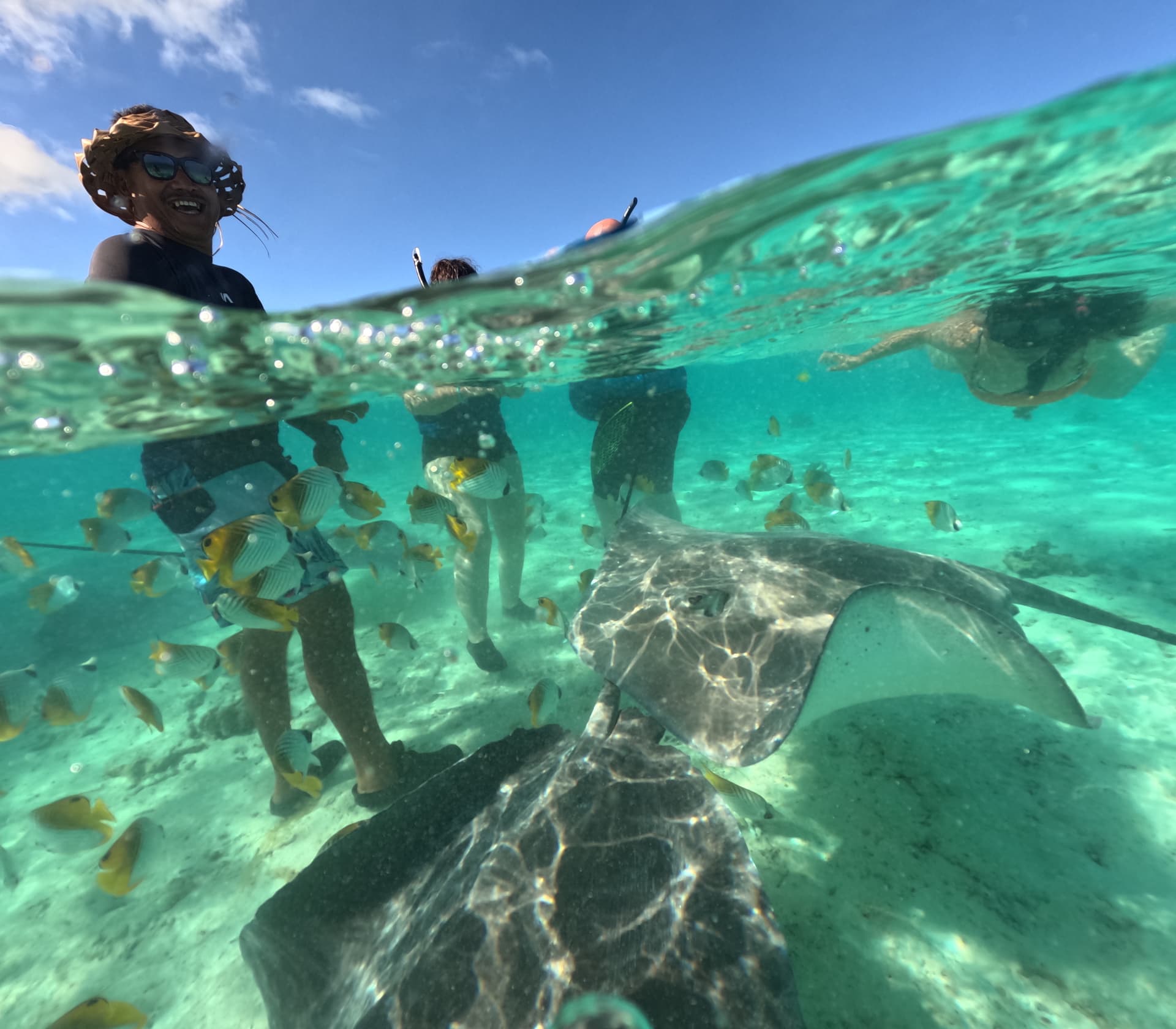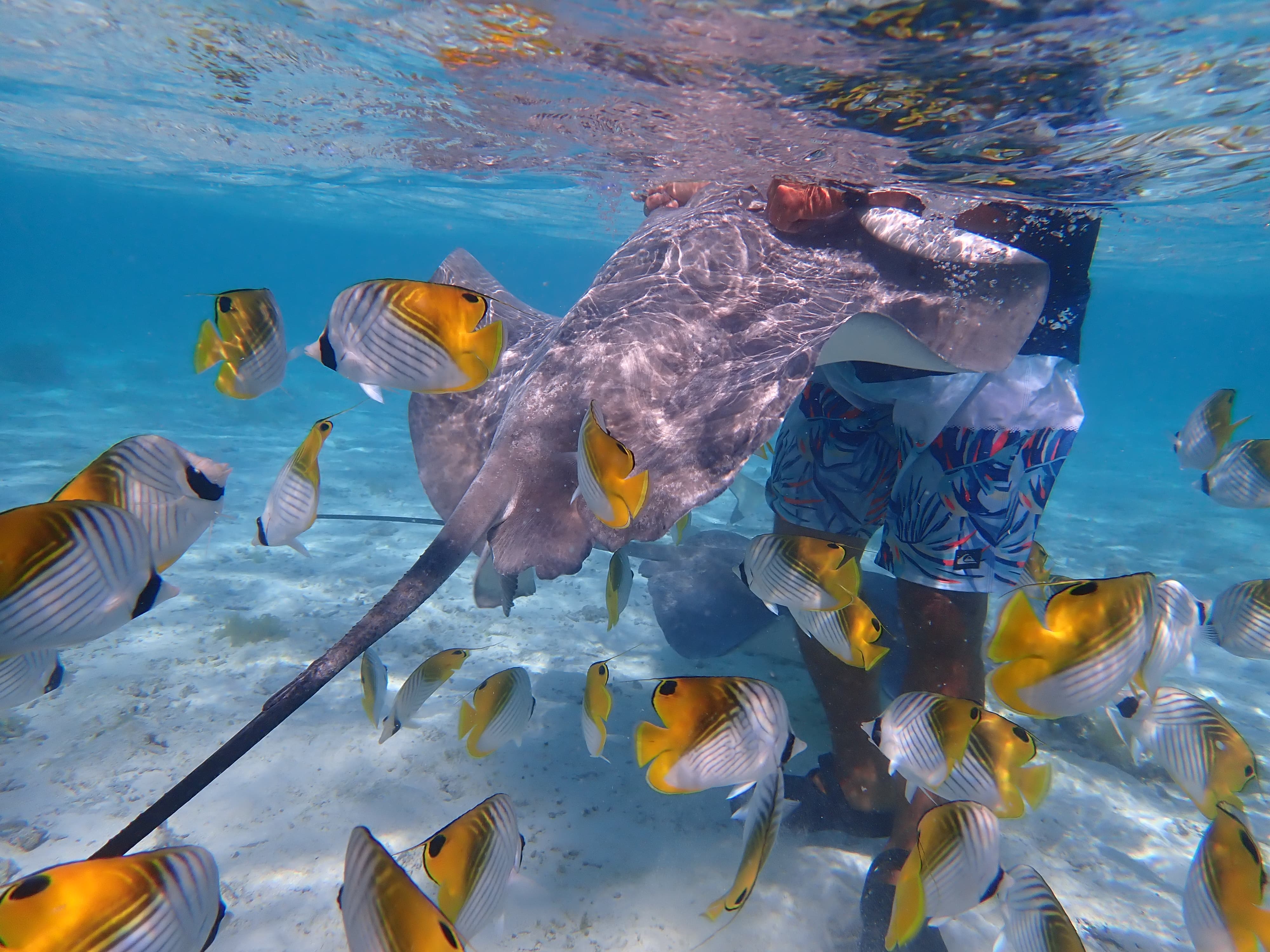 下一个点是我们已经在Moorea体验过的黑鳍鲨和鳐鱼——然而这里的体验比Moorea好得多,不仅除了黑鳍鲨和鳐鱼还有很多蝴蝶鱼(就是不知道鲨鱼鳐鱼会不会上班吃同事