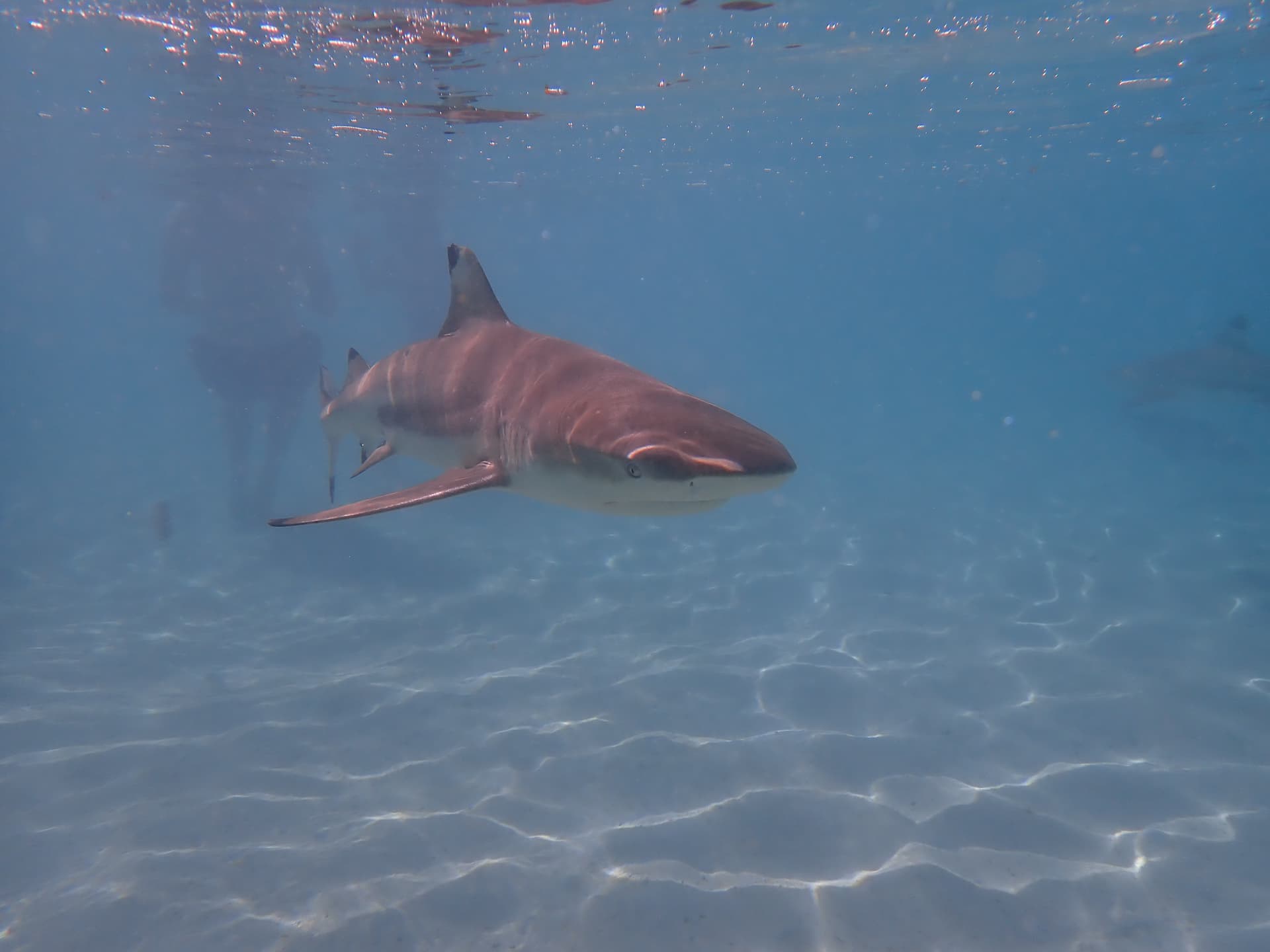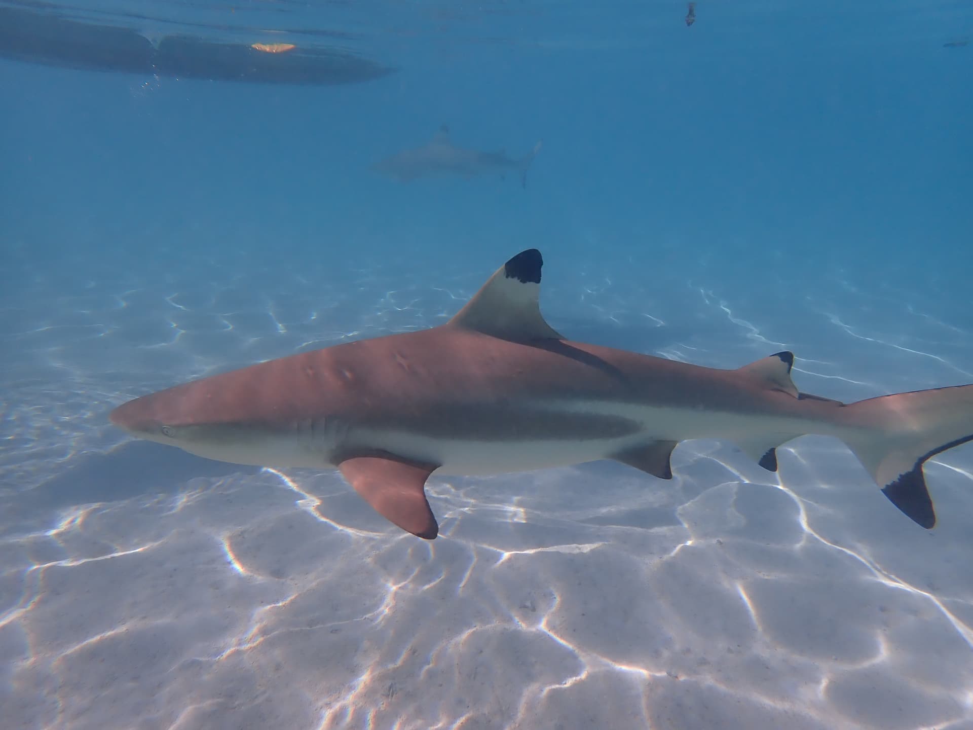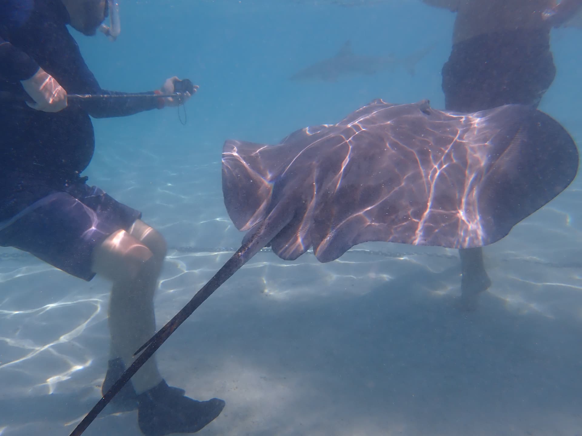 下一个点是我们已经在Moorea体验过的黑鳍鲨和鳐鱼——然而这里的体验比Moorea好得多,不仅除了黑鳍鲨和鳐鱼还有很多蝴蝶鱼(就是不知道鲨鱼鳐鱼会不会上班吃同事
