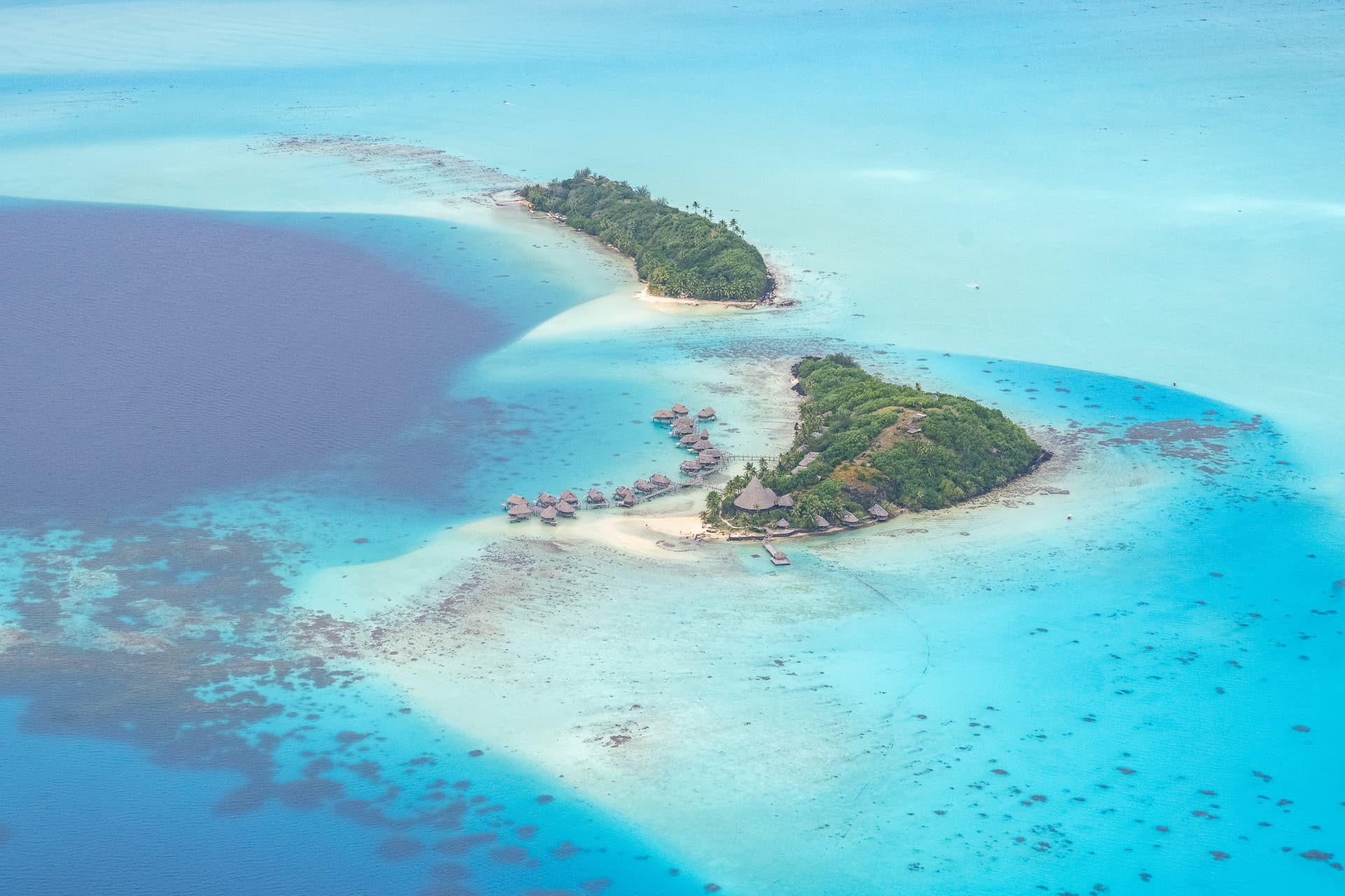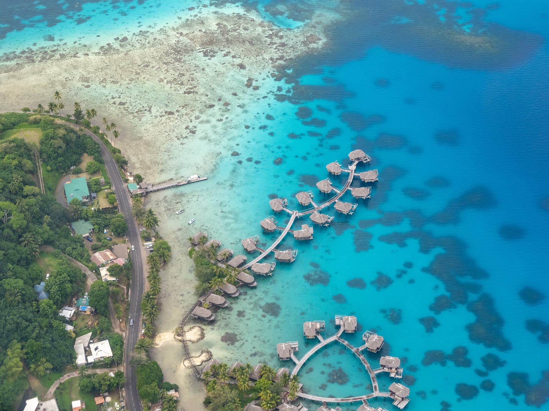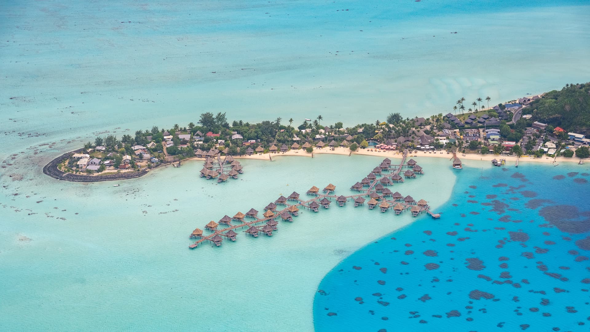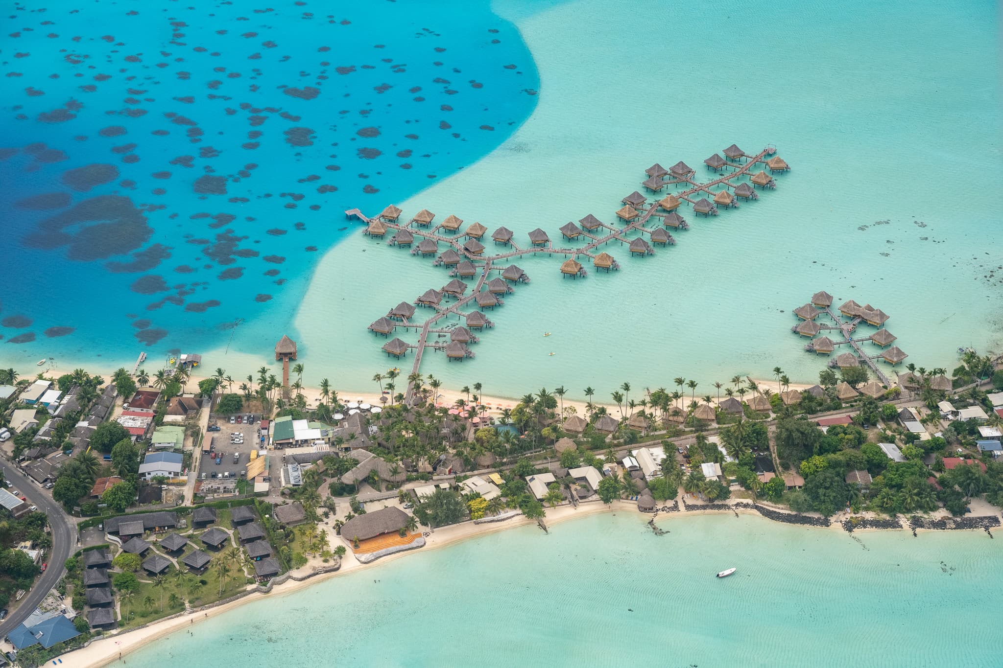 飞机飞过我们一会的酒店Intercontinential Le Moana,可以看到这里的水屋所在的潟湖几乎是岛上所有度假村里水最浅的,所以颜色要更“果冻”一些。此外这里浅水区深水区交界处泾渭分明,也有深水区的平台可以下去。