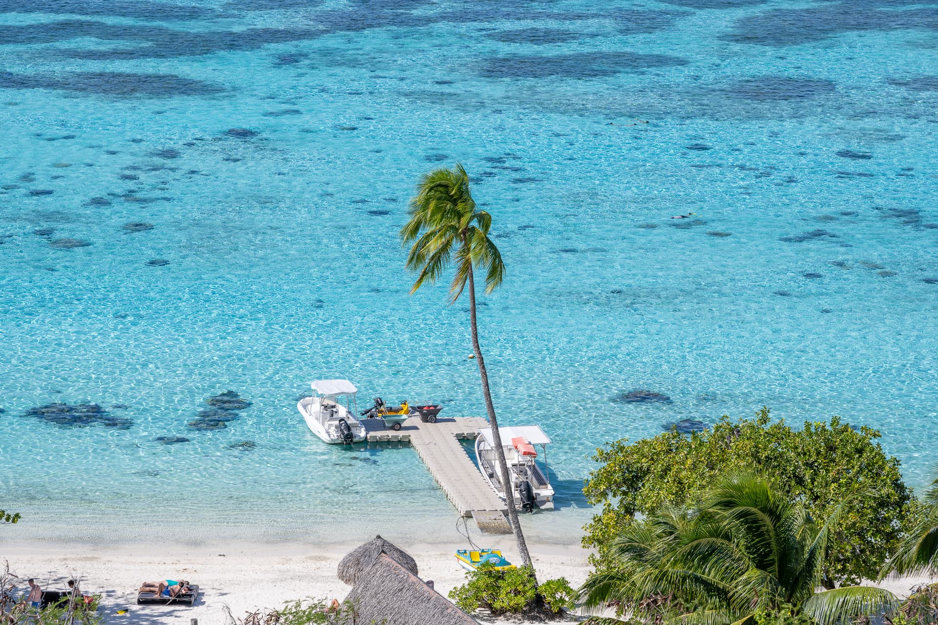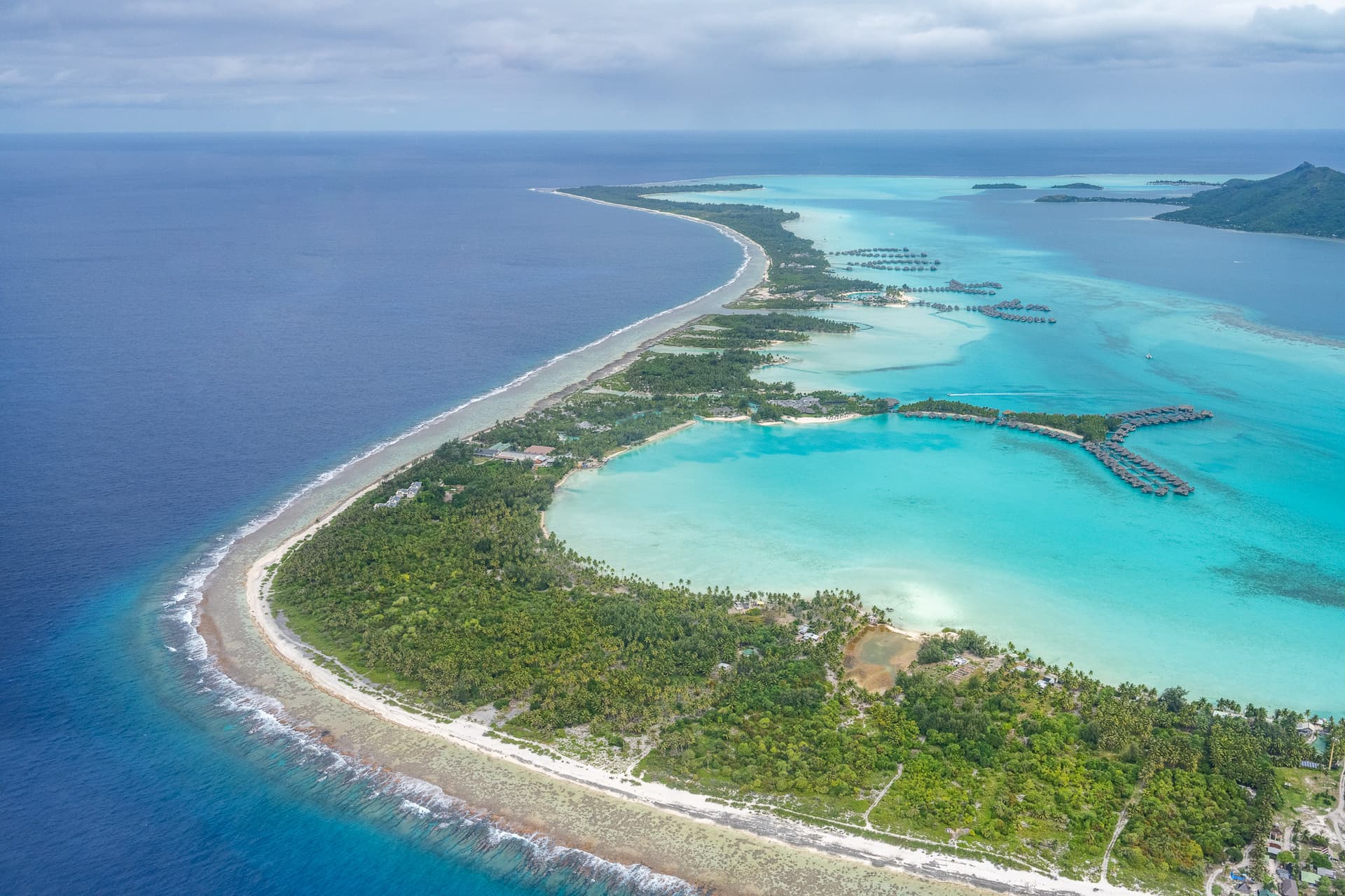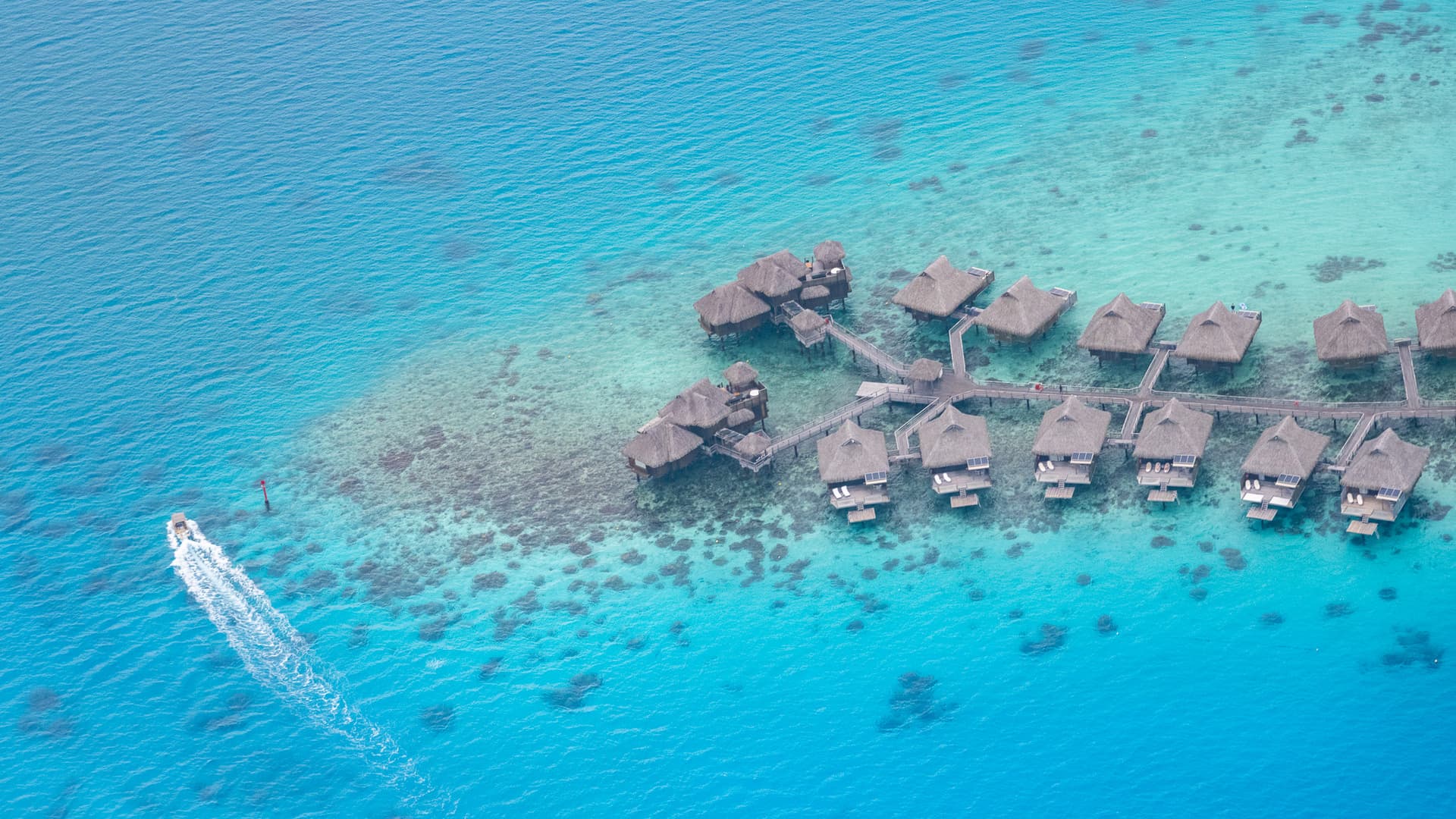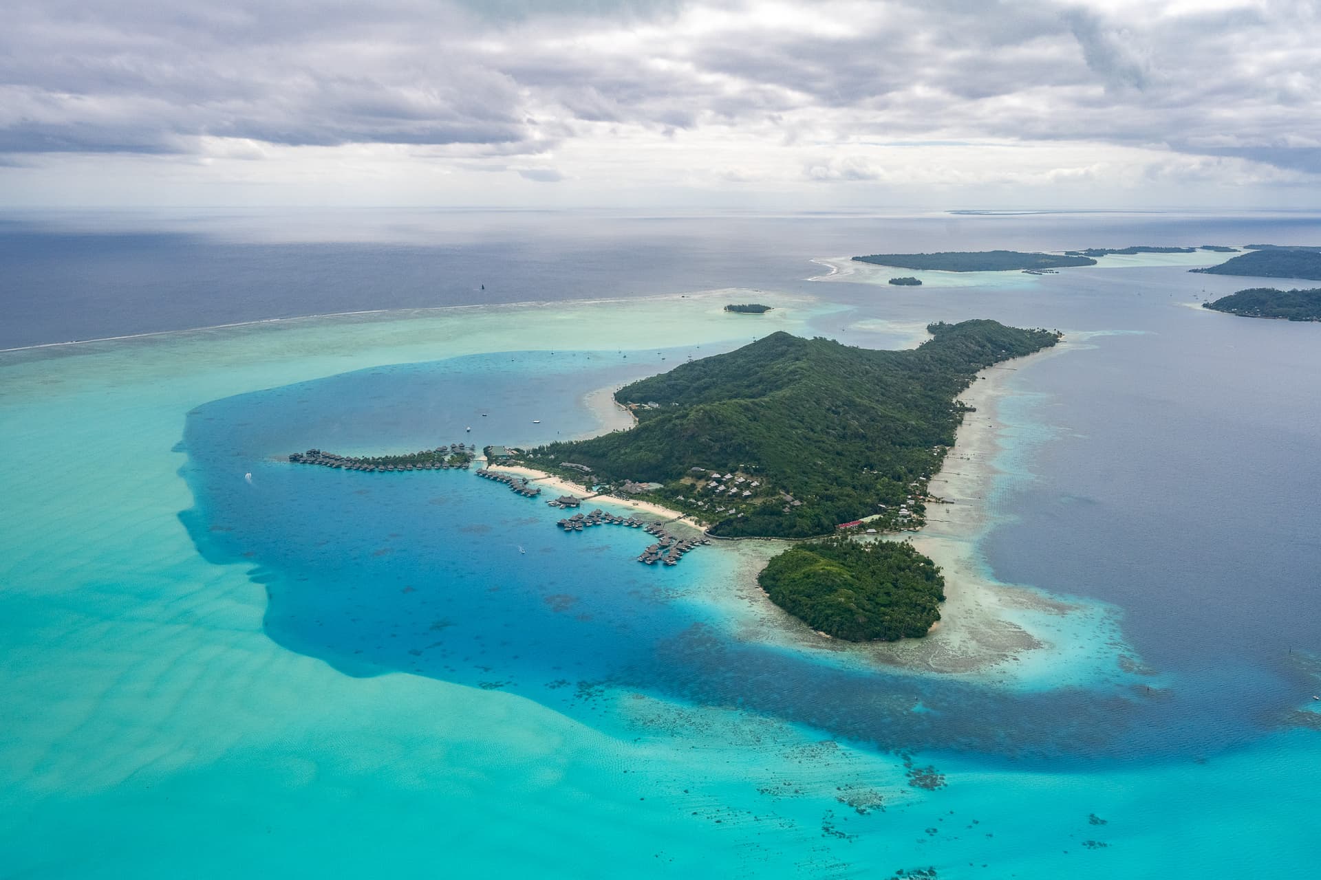 飞机飞过我们一会的酒店Intercontinential Le Moana,可以看到这里的水屋所在的潟湖几乎是岛上所有度假村里水最浅的,所以颜色要更“果冻”一些。此外这里浅水区深水区交界处泾渭分明,也有深水区的平台可以下去。