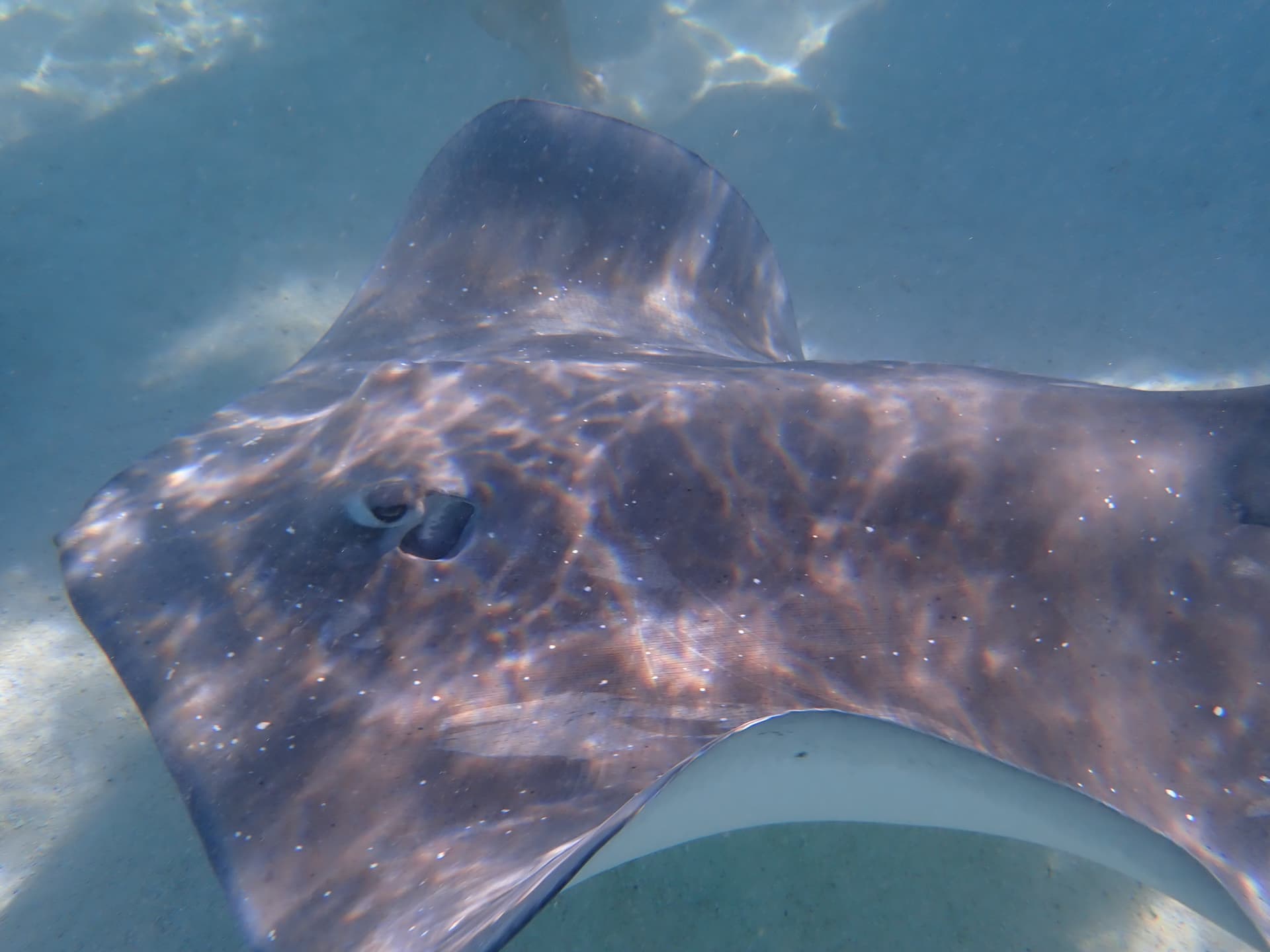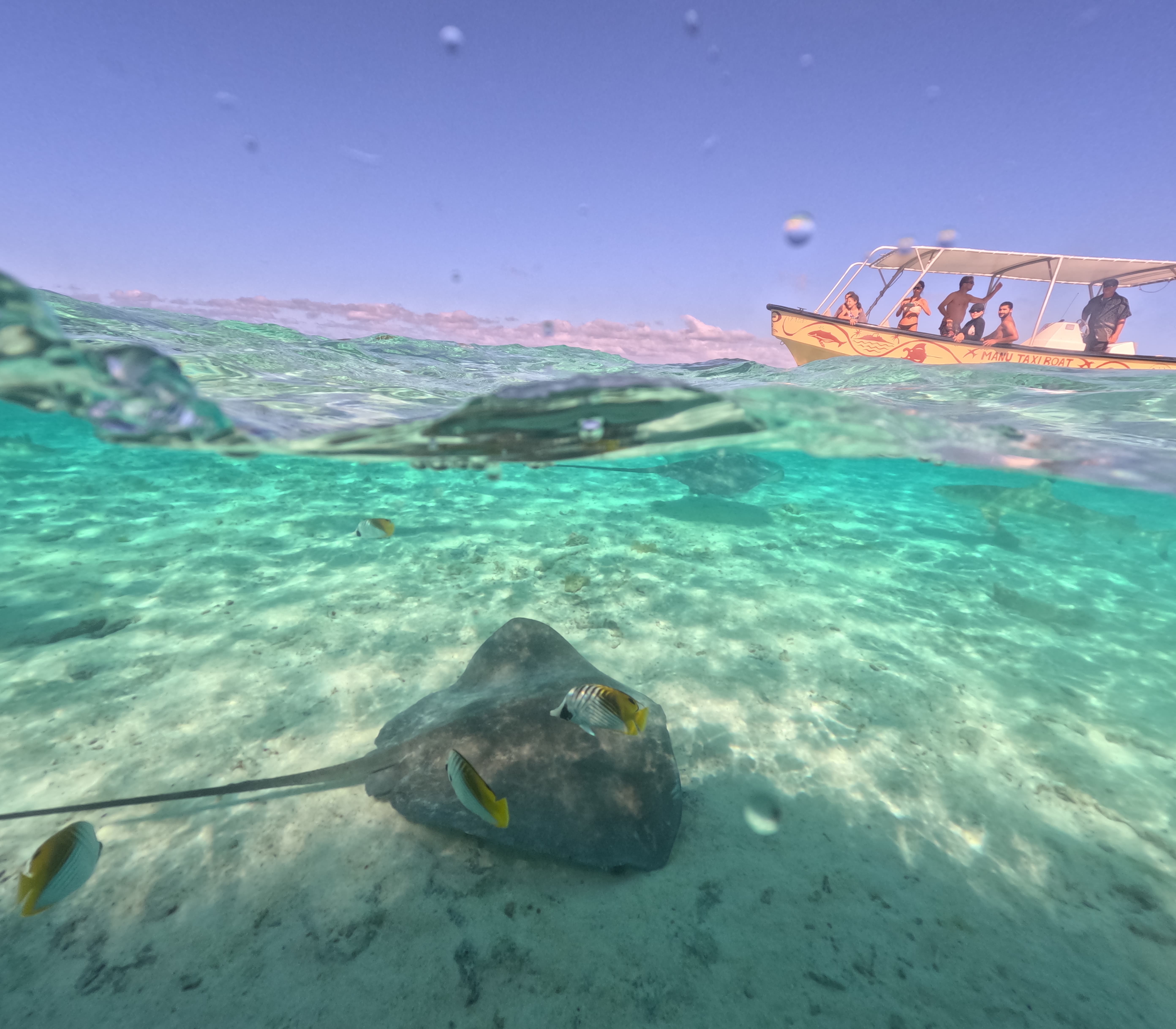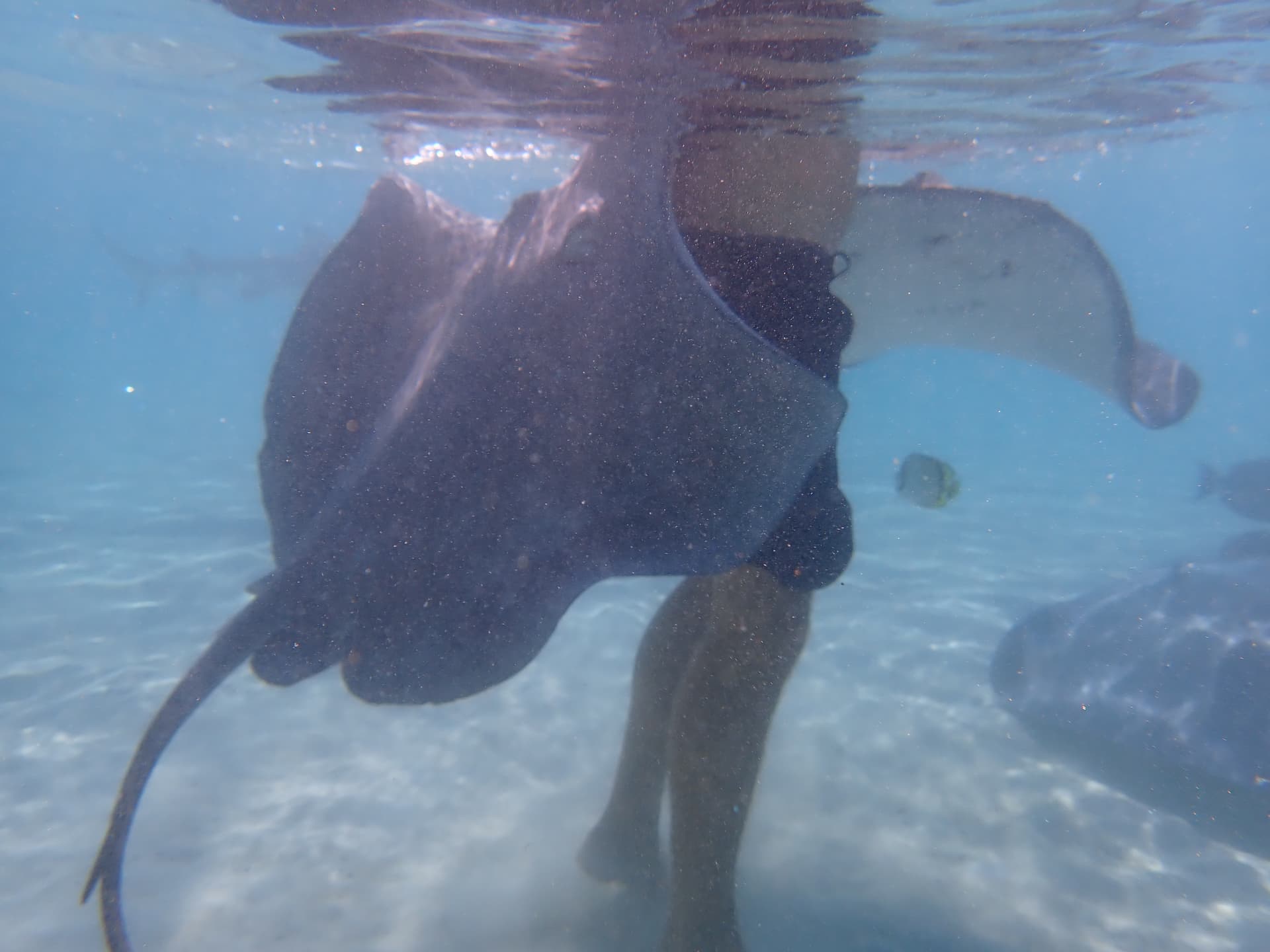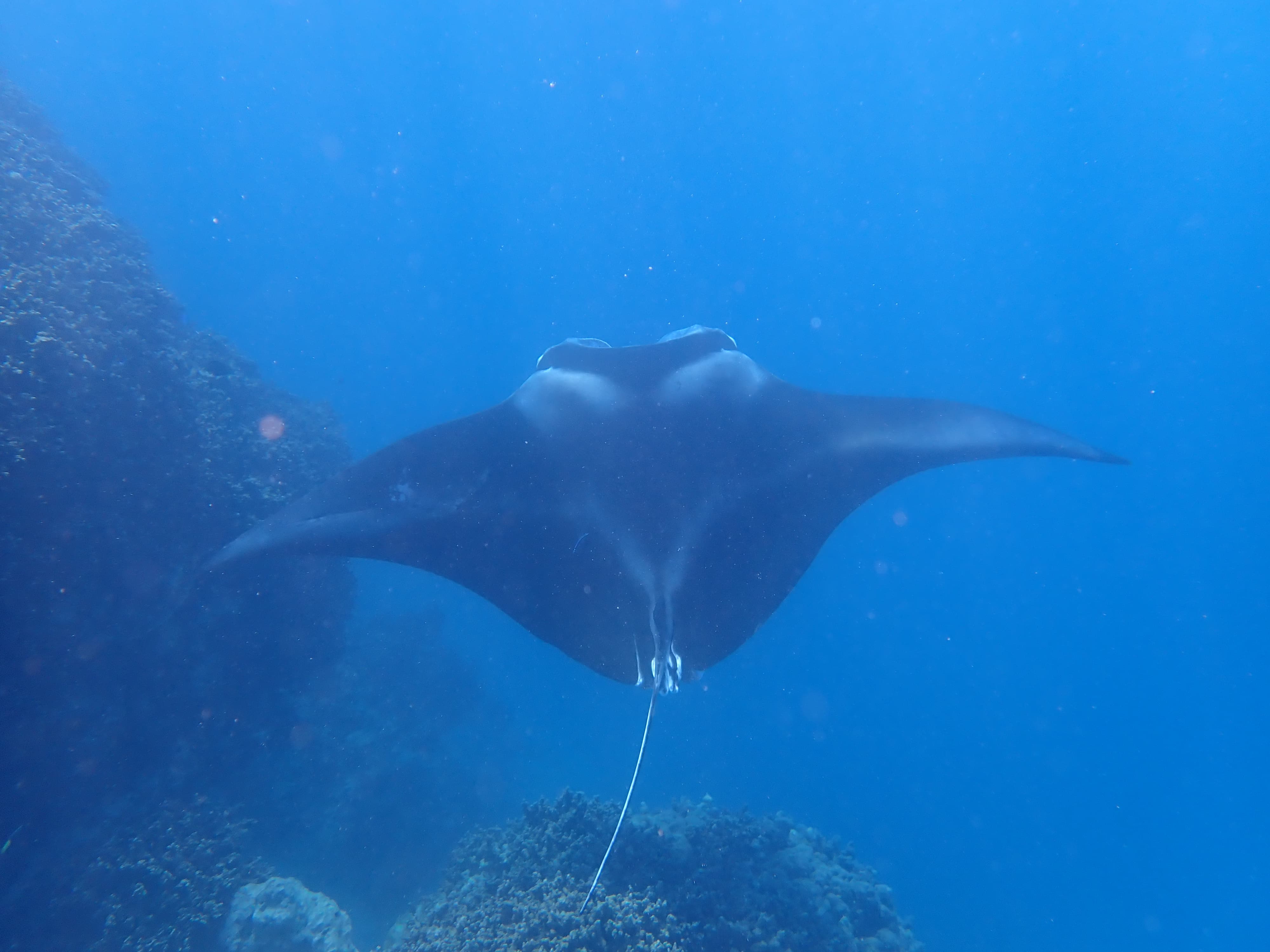 八点十分准时上船浮潜,第一个点是与蝠鲼(魔鬼鱼)游泳——我想泥潭很多人应该去过夏威夷的夜间魔鬼鱼游泳tour,然而在大溪地甚至都不需要用光线去吸引浮游生物从而吸引它们,在白天就能看到它们在水中从容地飞翔,它们或许是这世界上最优雅的生物。