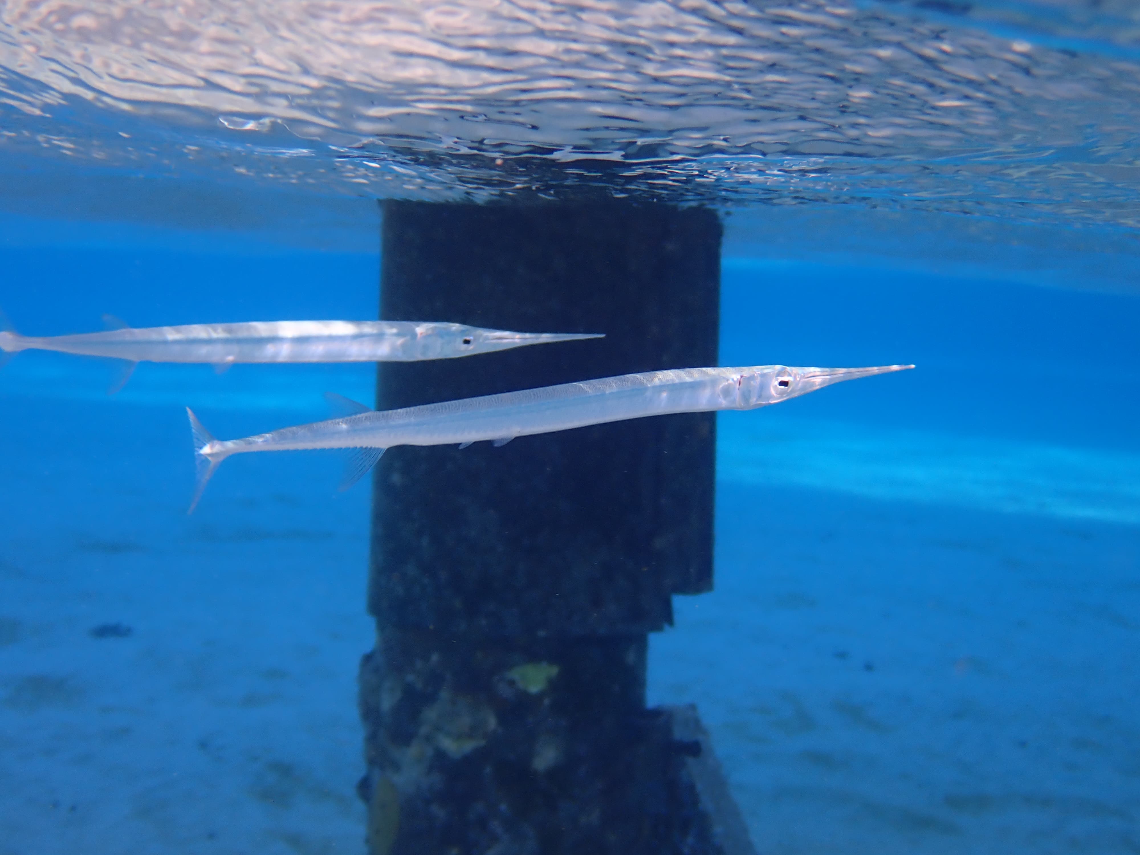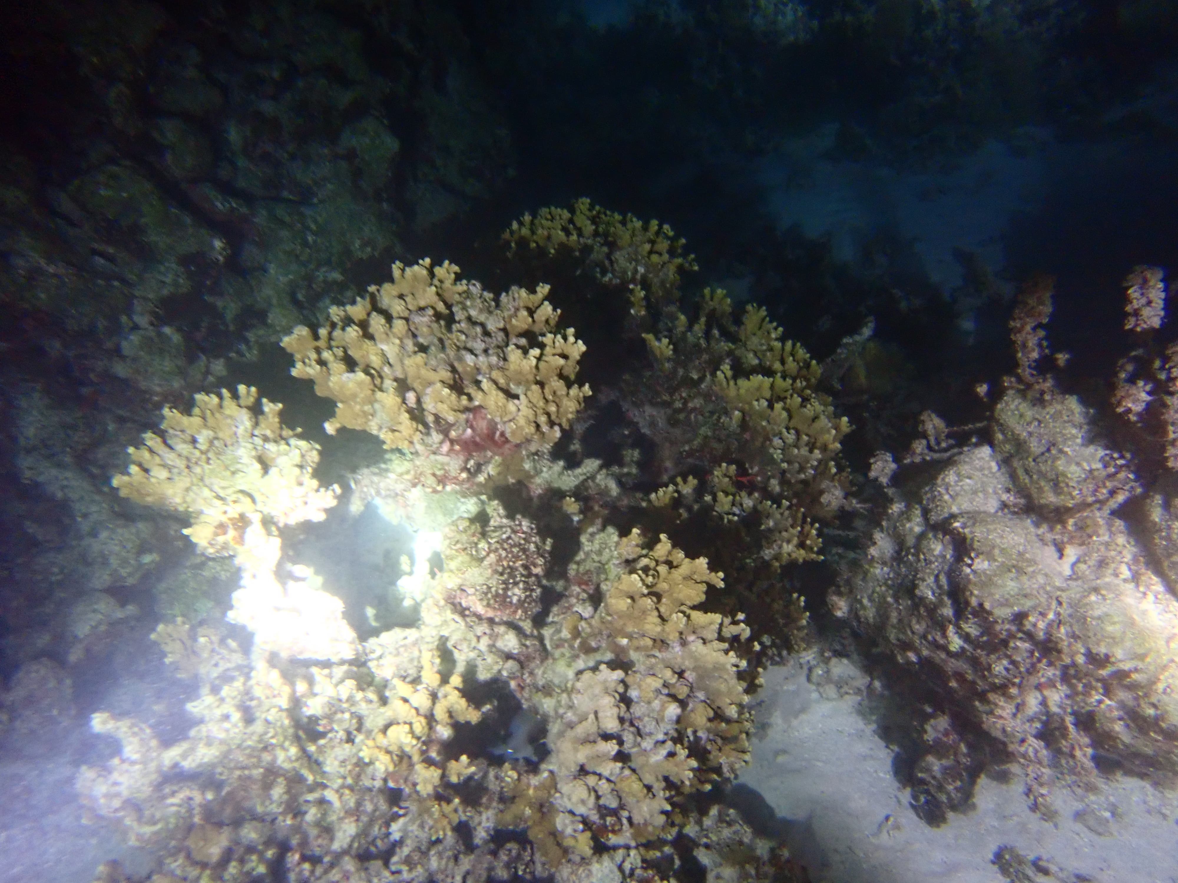 晚上的水屋下方也可亮起灯仍旧可以游泳,我于是下水看了看,大部分鱼都躲在了珊瑚礁中,只有少量的金目鲷和水针鱼还在活跃。