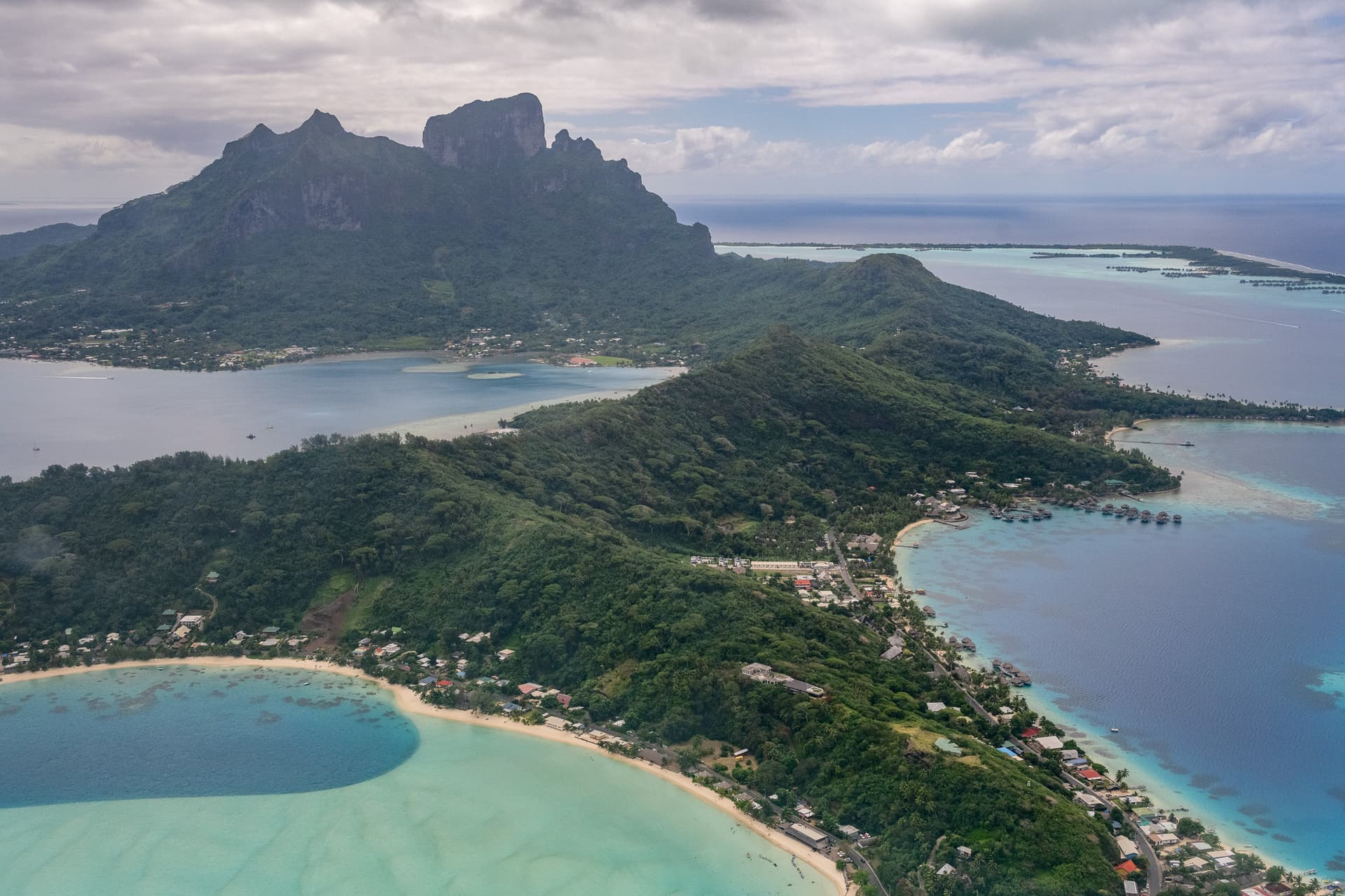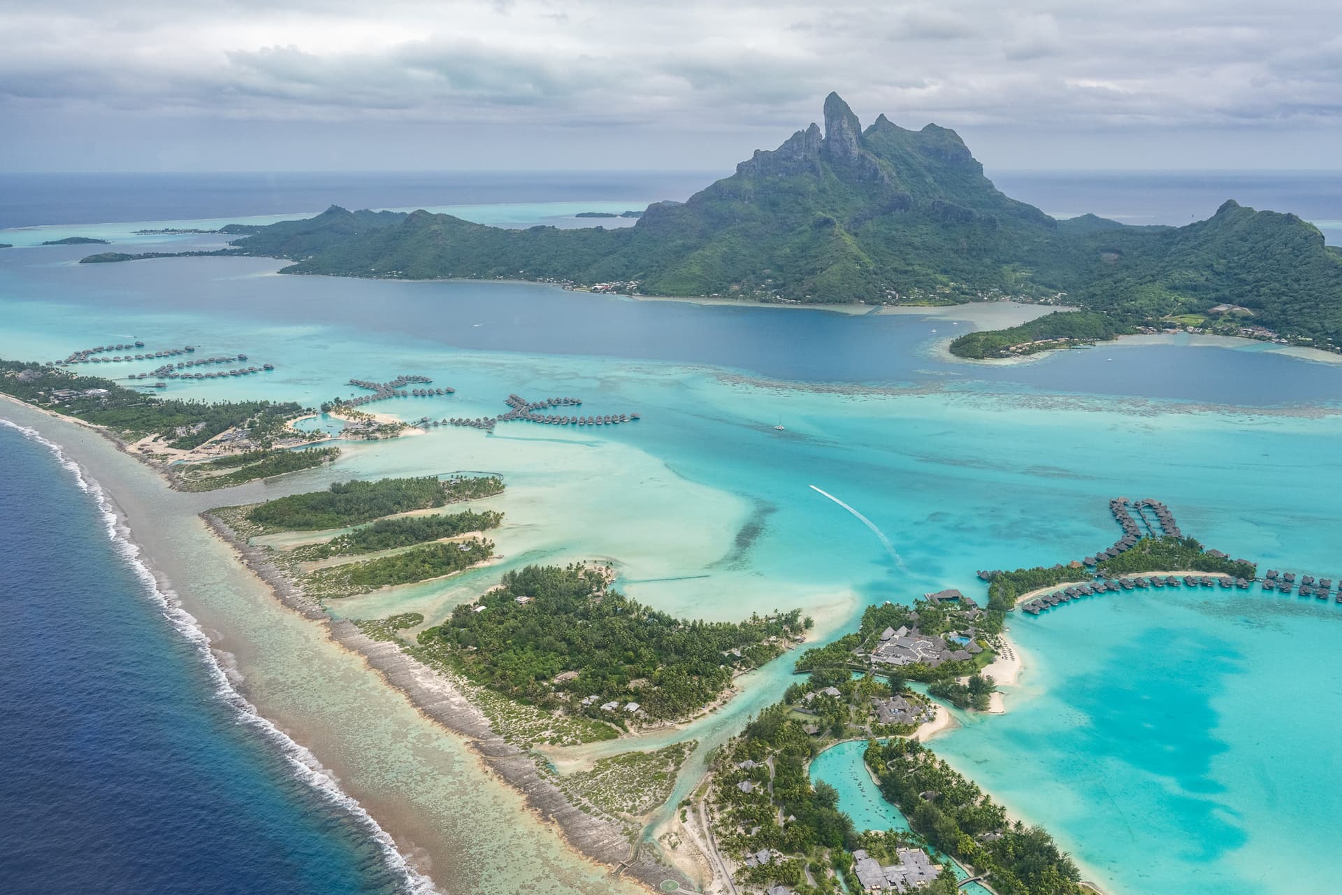 虽然当天Bora岛风不小,但飞行本身非常平稳,一路上Otemanu神山的天际线随着视角变化,潟湖内不同水深颜色分明,不真实得仿佛不在地球上。