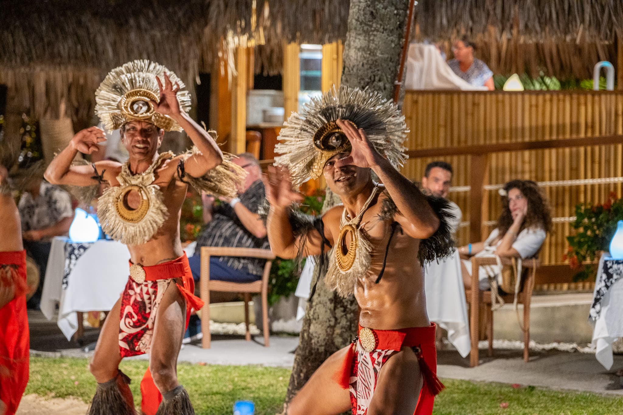 浮潜结束后我们在酒店看了日落,然后去酒店门口的餐厅The Lucky House吃了晚饭——听名字像中餐但是实际上是做披萨和带点本地特色的美式食物的,口味非常好,价格也比酒店便宜,强烈推荐。回到酒店后已经天黑,大堂和餐厅附近各种敲锣打鼓的“本地文化表演”,我对这种以娱人为目的的“保持落后”想来持保留态度,就路过随手拍了两张。
