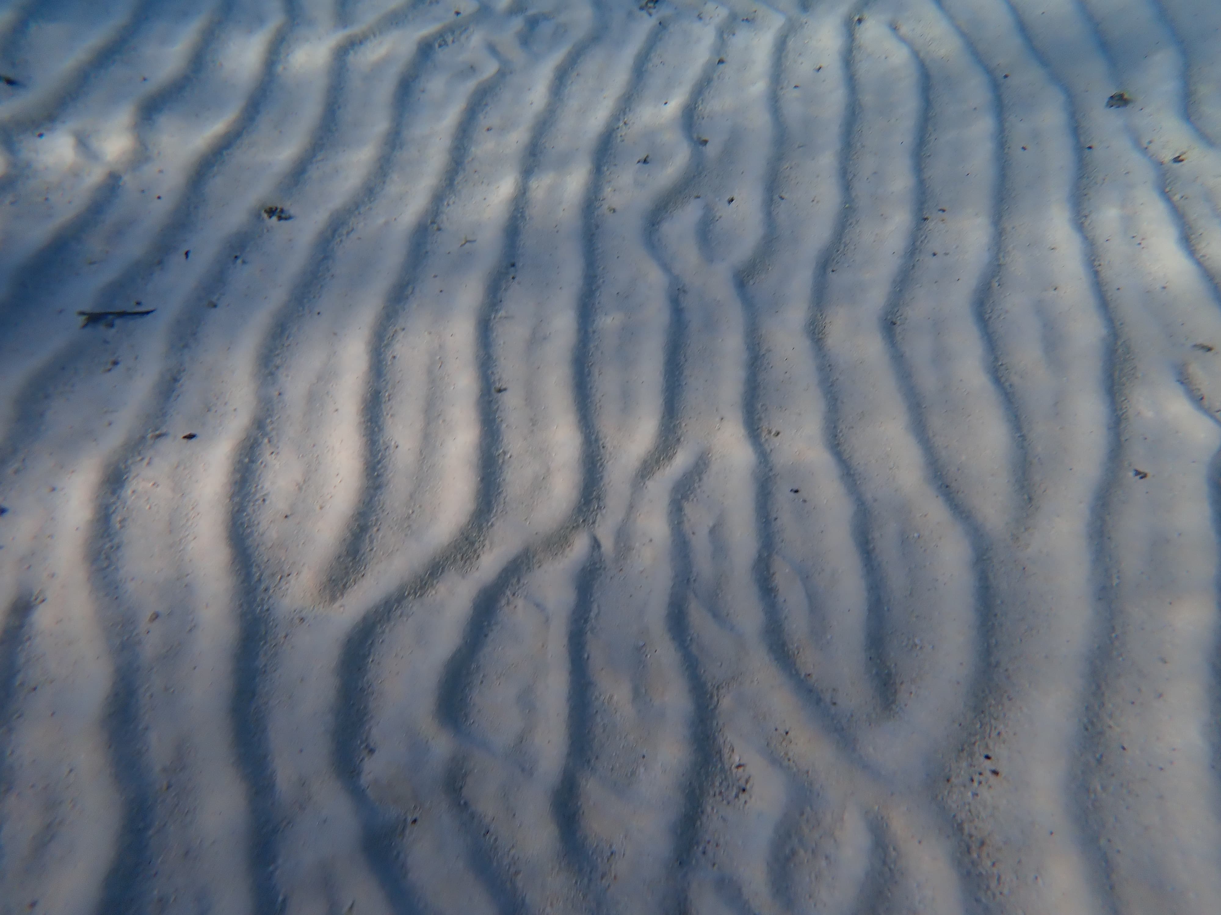 早饭后我们即将参加Rohivai Tours的半天浮潜tour,短短三个半小时会去4个浮潜点:魔鬼鱼,黑鳍鲨和鳐鱼,珊瑚花园和纳氏鹞鱝(Spotted Eagle Ray)。他们会直接从酒店的Dock免费把人Pick up,价格只要90一人,比黑心酒店的Shuttle boat高到不知哪去了……于是在他们来之前我又在清晨继续下水浮潜拍照了一波。一晚上的大风让海底的沙子呈现出沙漠一般的波浪纹理:
