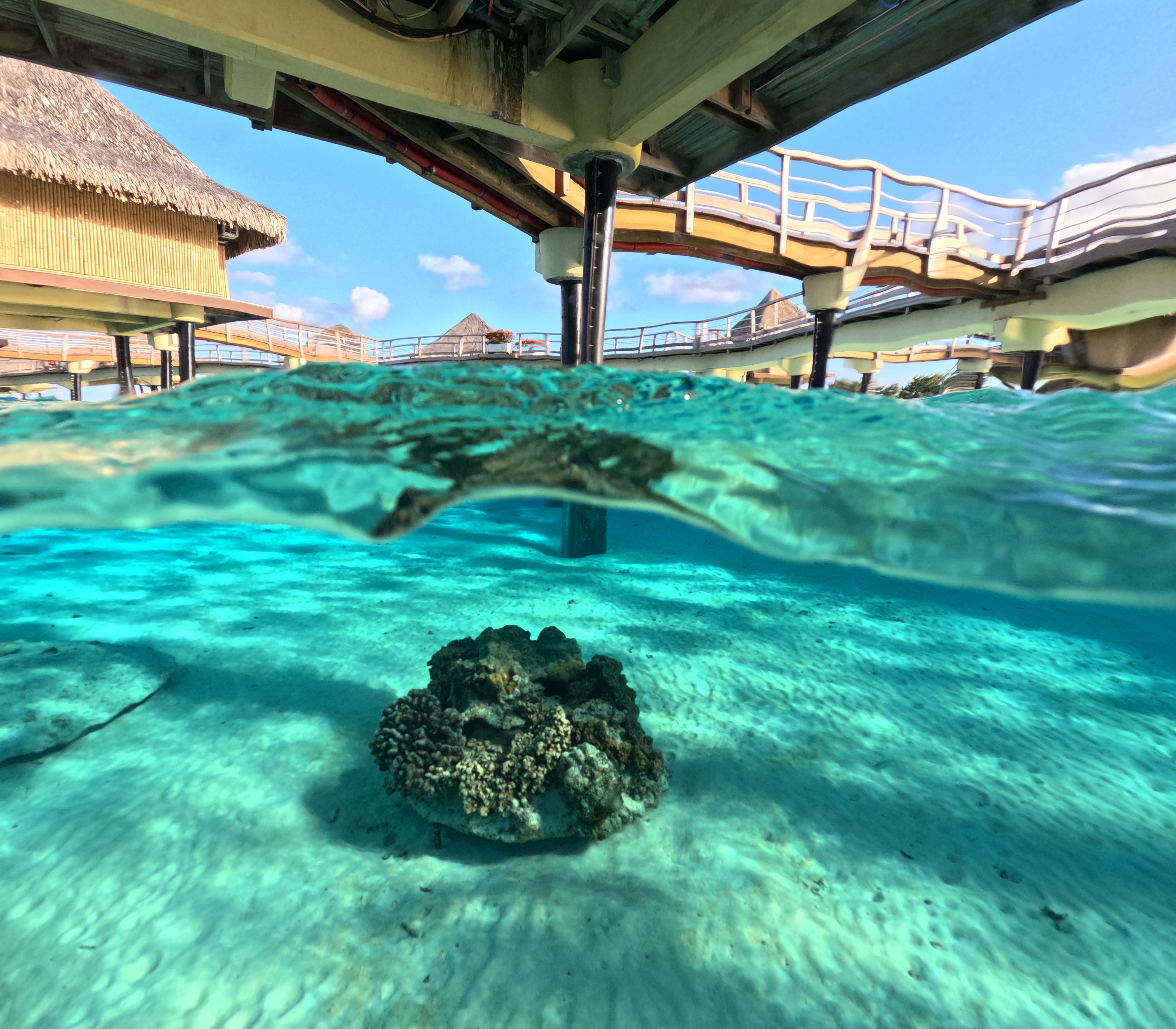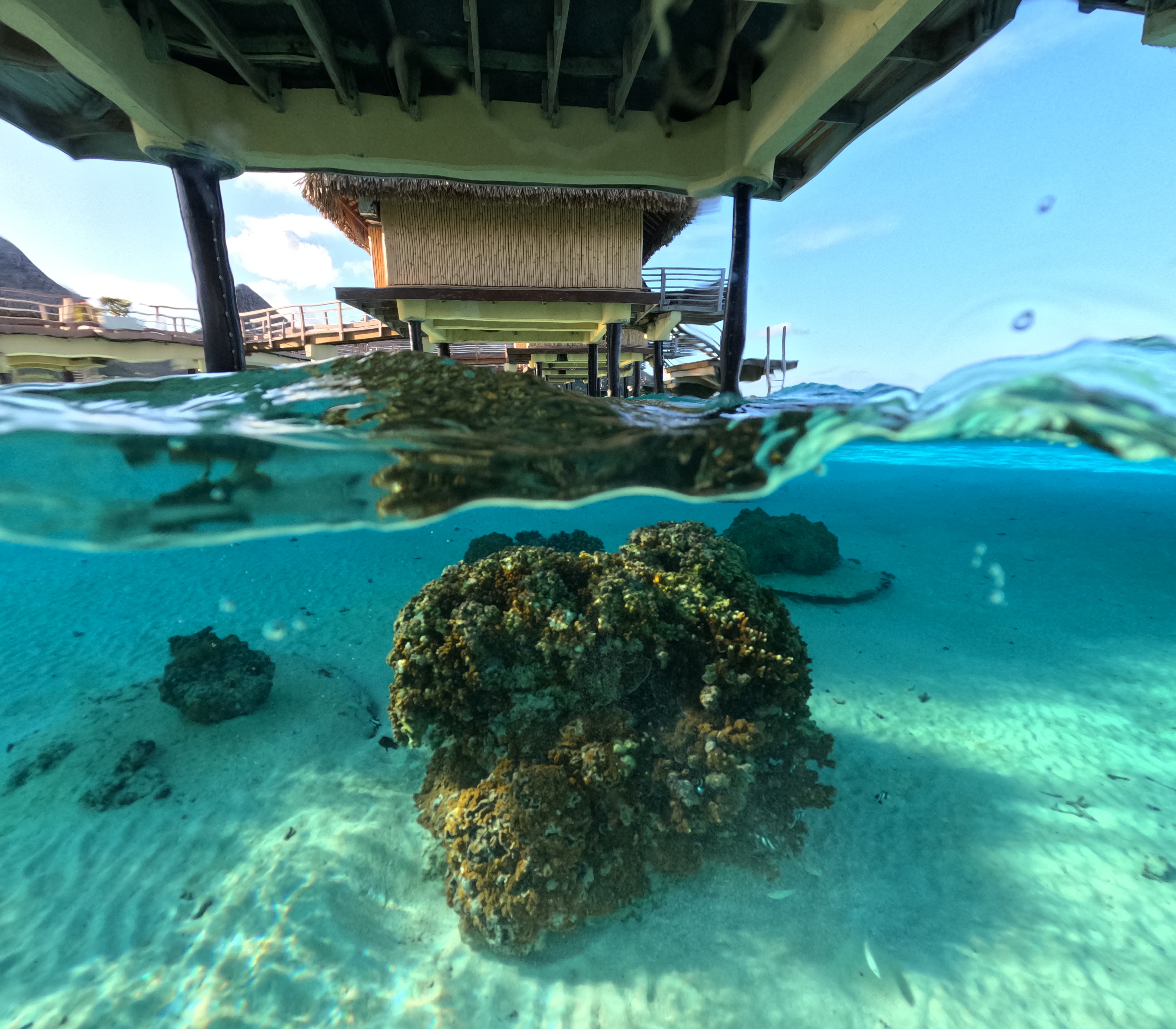 距离日落还有快两个小时,已经足够我们在水屋周边探索了。酒店有一个Dock可以进入深水区,坐飞机观光时就看到那边海水湛蓝清澈,一丛丛的珊瑚礁十分茂盛。我果断一个猛子跳进水里,然后一路游回了我们的水屋。