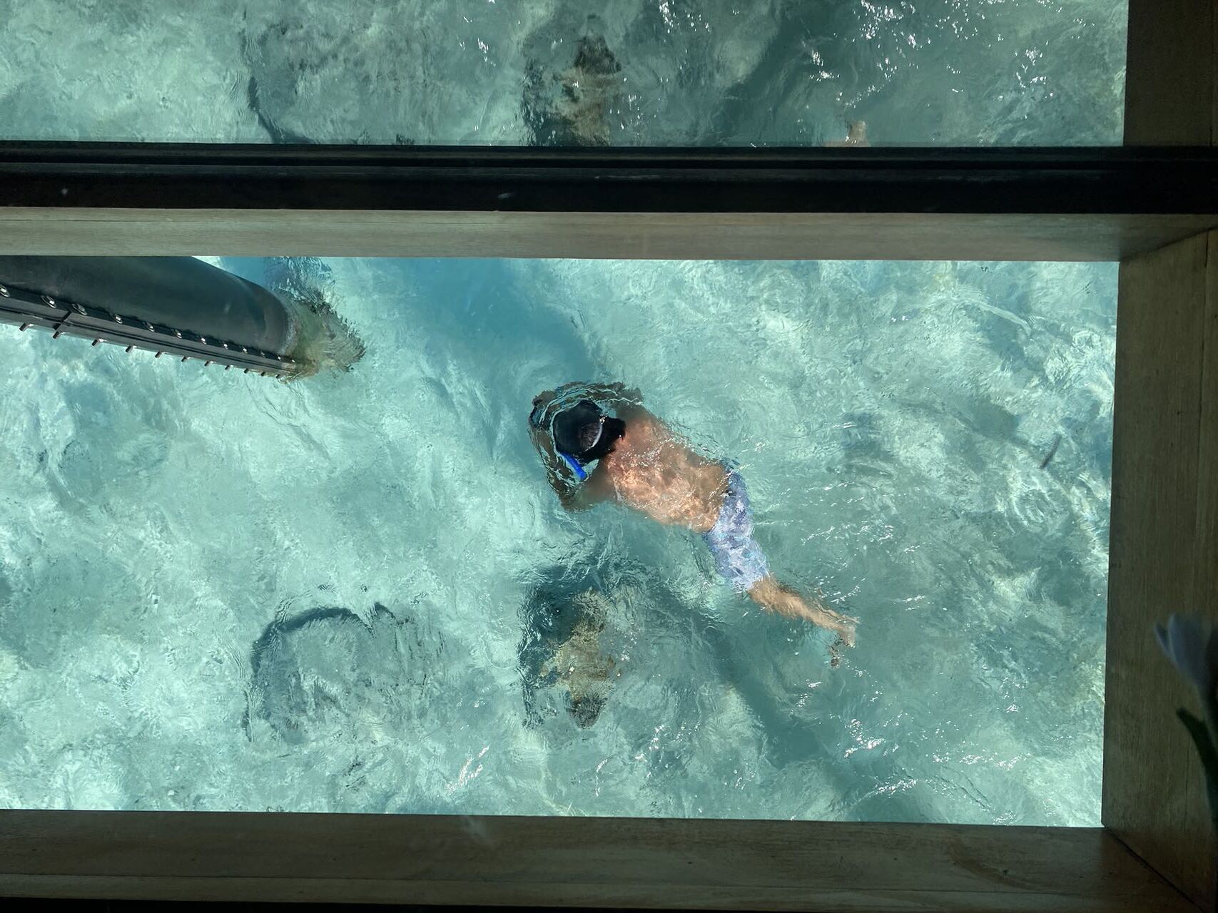 回到酒店后虽然已经退房,但仍旧能享受酒店设施直到出发去机场之前。正是中午光线最好的时候——与其他地方最美总在日出日落不同,果冻海最美的时候永远是正午光线最强的时候。于是继续浮潜,沐浴在水波荡漾的浮光跃金之中。