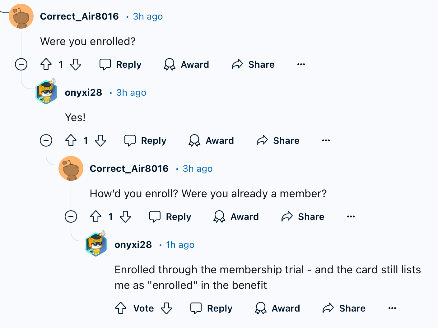 During this trial period, you can enroll any other Platinum you have by choosing Current Member. You enter the card details in the next page and that card will be enrolled. The card on file, to be charged for the membership, will change to this new card you put in.