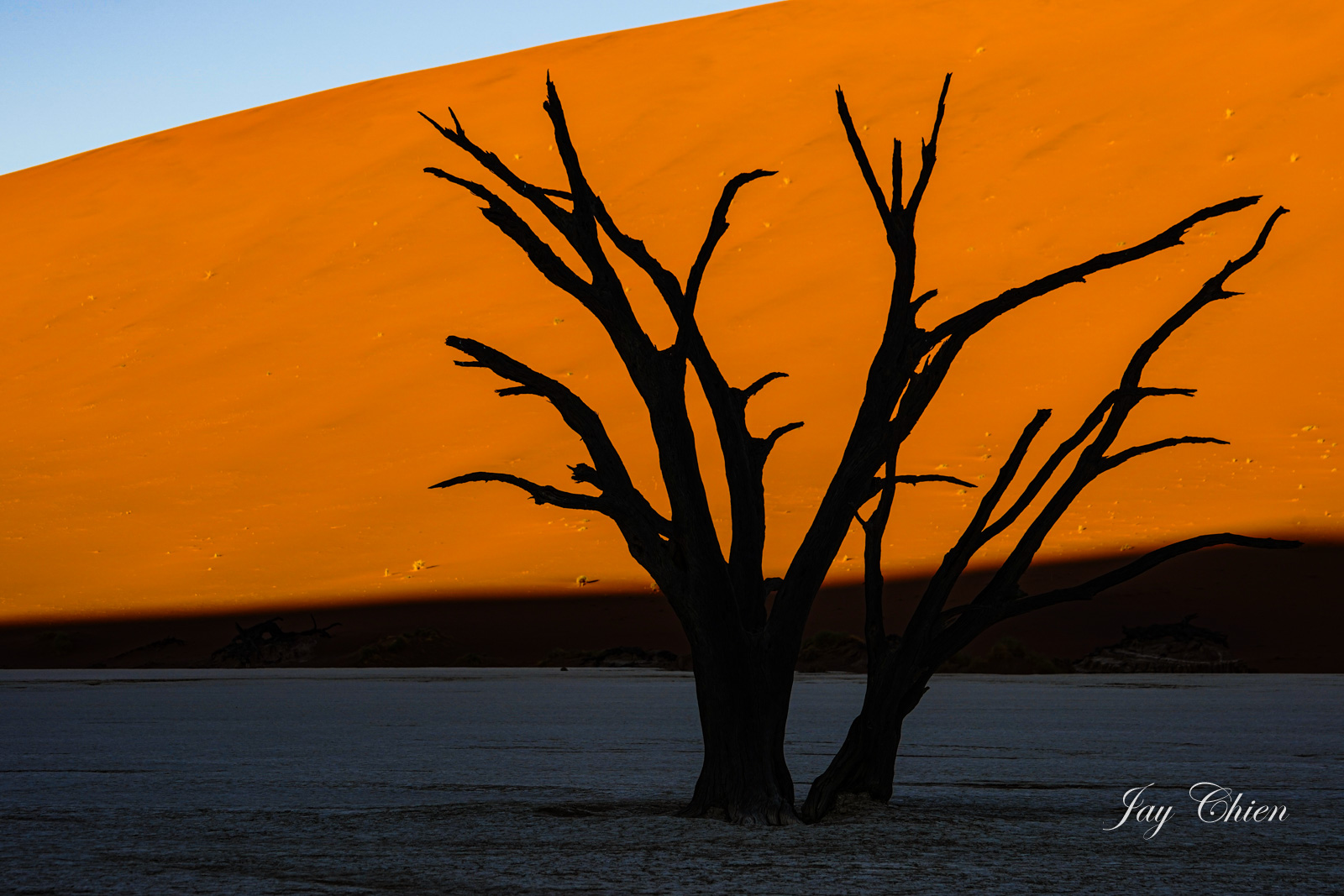 死亡谷離國家公園入口處60公里, 千年前這是一片河谷, 但隨著沙漠的入侵河流乾涸, 加上炎熱乾燥的氣候所以樹木很短時間化為焦炭, 加上乾涸的河床鹽沼, 我們第二天日出時來到死亡谷, 一半太陽的光, 沙丘的影子, 白色的鹽沼, 黑色的枯木, 我拍到最後都感受到很濃的禪意.