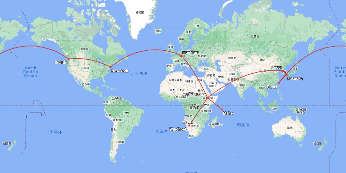 SEA-JFK-FRA-ADD-WDH-ADD-SEZ-ADD-ICN-FUK-TPE-SEA