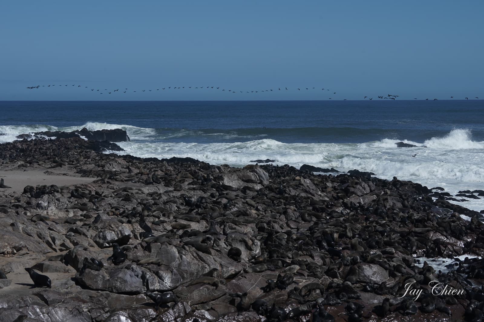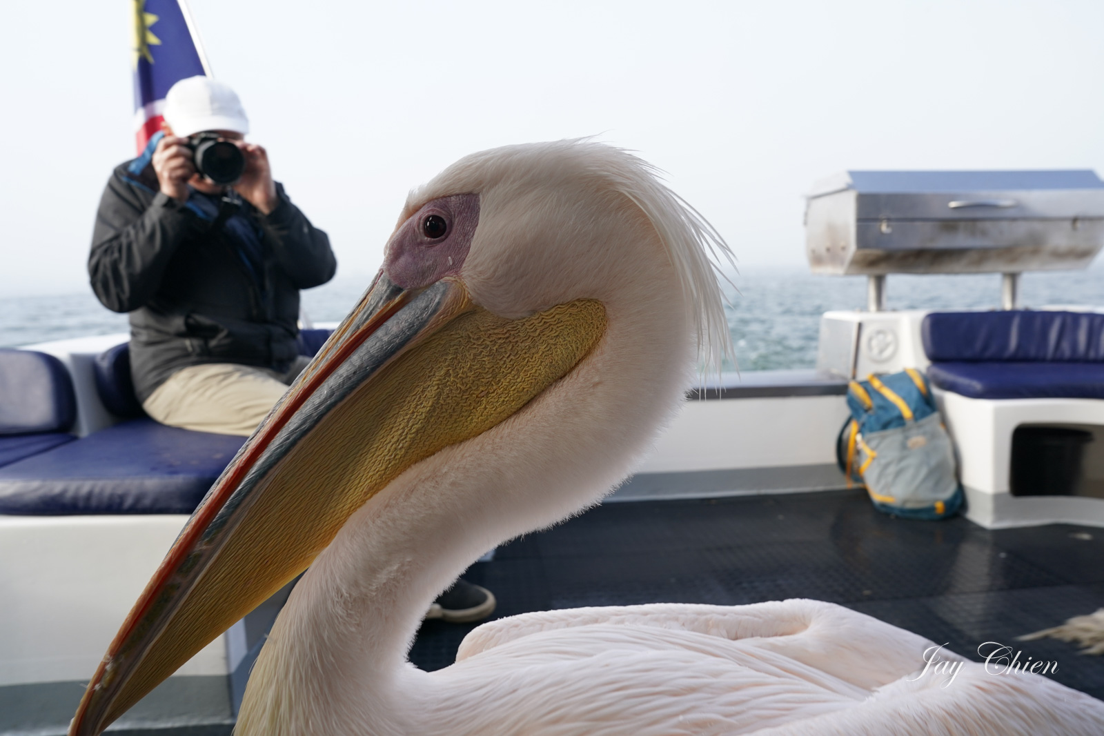 鯨灣的行程之一-出海看非洲毛皮海獅以及鵜鶘. 這裡的鵜鶘根本沒在怕人, 一出海就飛上船討東西吃