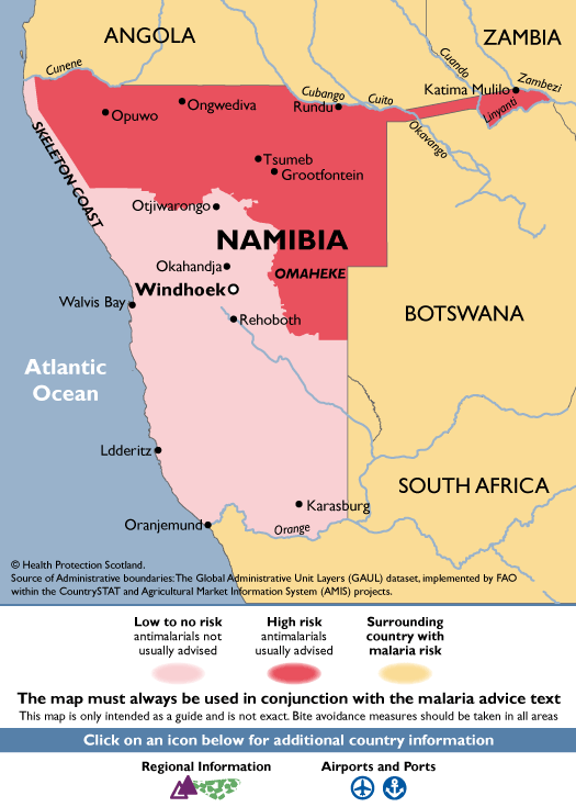 瘧疾沒有疫苗, 且對兩歲以下小孩藥物效果差, 對五歲以下孩童致死率較高 這是讓我們最頭痛的, 因為納米比亞雖然大部分景點不用擔心霍亂, 但是該國北部是瘧疾肆虐區, 包含了西北的埃普帕瀑布, 東北的維多利亞瀑布, 以及埃托沙公園的大部分, 為此我們只能放棄兩瀑布, 在埃托沙公園格外小心, 注意防蚊