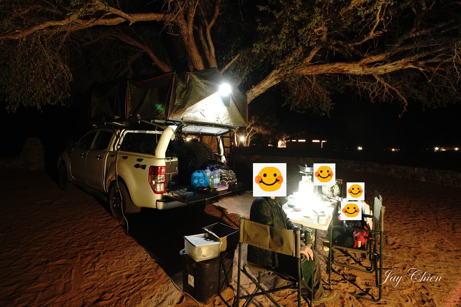我們最後因為預算選擇自駕, 19天同樣的行程租車住宿最後算下來大概7000美元, 我們租了台搭載車頂帳篷的皮卡, 後面放了冰箱, 備胎, 第二備胎, 第二電池, 發電機, 兩個瓦斯罐, 全套烹飪工具, 桌椅, 真的是為露營而生的配置. 第二備胎也很重要, 我們這次旅行輪胎就破兩次, 輪框壞了一次要換輪胎, 不得不說納米比亞的路真不好開, 來之前要有點心理準備, 要是不想處理這些破事, 那就當大爺請當地旅行社出個司機嚮導廚師帶你走就好.