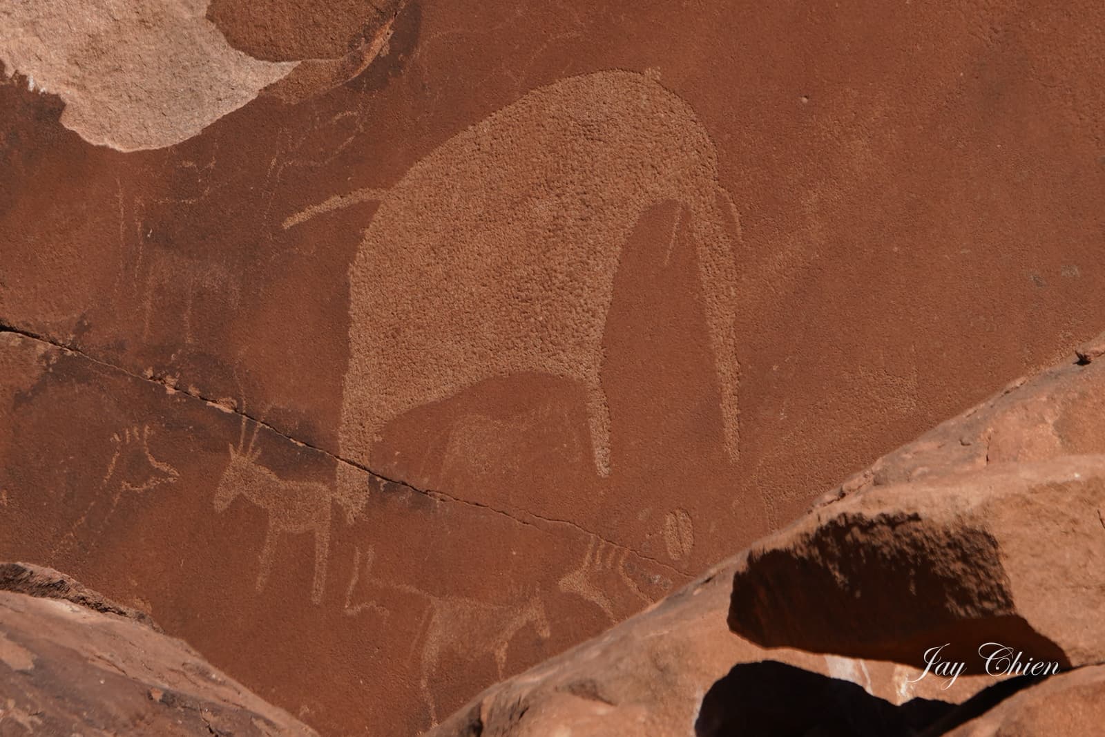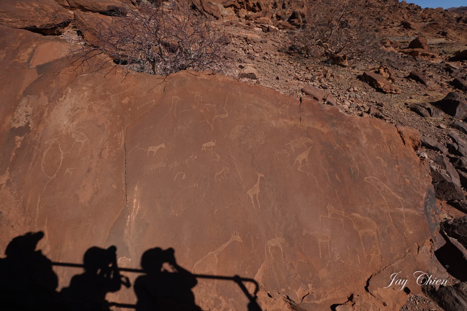 頹廢方丹是納米比亞唯一的文化遺產, 這紀錄了布須曼人看到的各種動物以及怎麼狩獵. 神奇的是竟然有記錄到1000公里外海岸的企鵝(上圖左邊), 導覽說這證明布須曼人為了取得鹽曾走到大西洋.