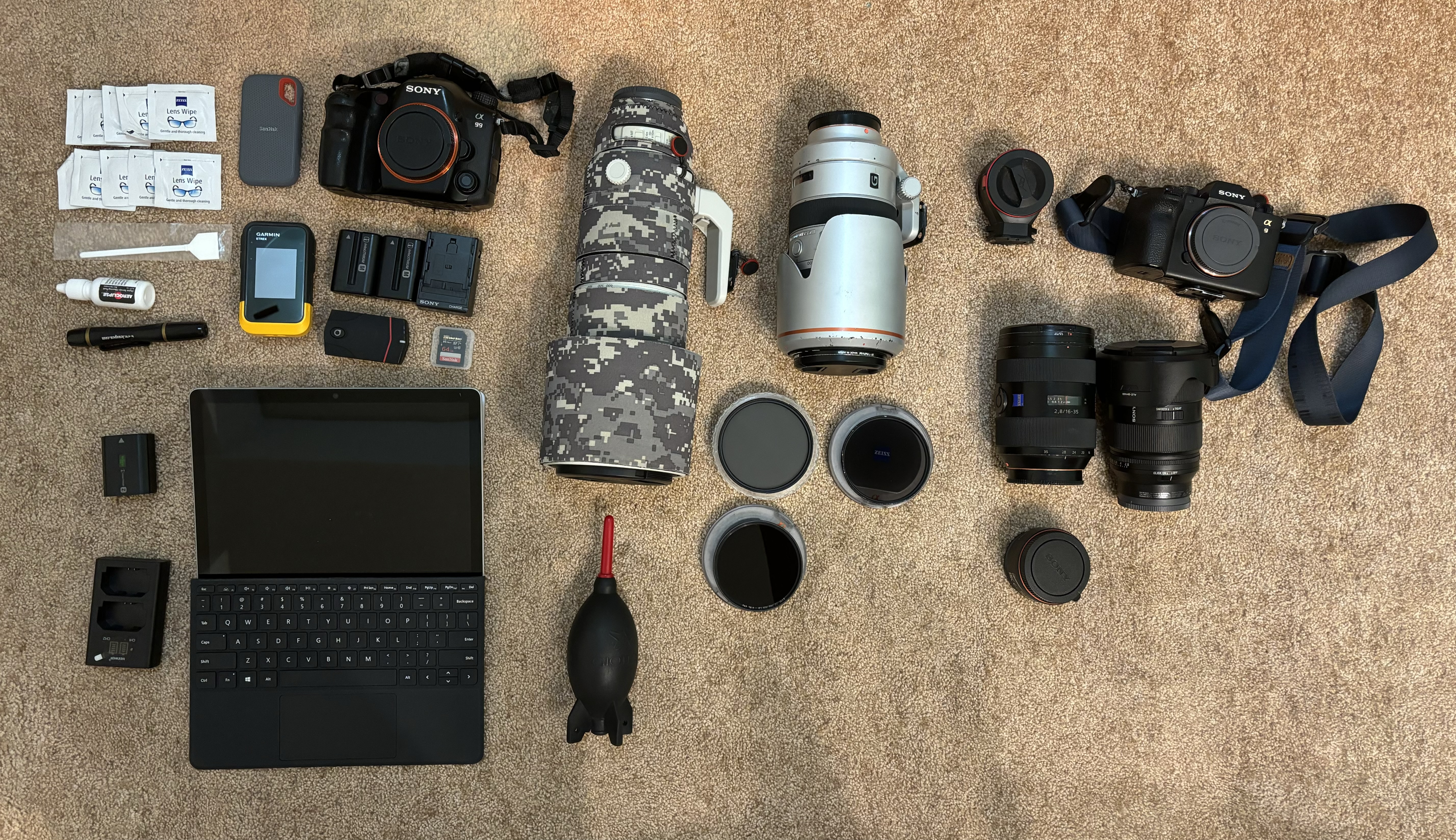 這次的裝備清單, 相機是Sony A9ii, Sony A99 (備用機), 電池充電器各二, 鏡頭為SAL1635Z, SEL2470GM2, SAL70400Z, SEL200600G, 鏡頭轉接環LA-E5, CPL77mm/82mm各一, 減光鏡B+W 77mm ND64x, 記憶卡64Gx3, 茄子快門遙控器, 火箭吹球, 蔡思拭鏡紙, Lens Pen, 日蝕水, 1TB行動硬碟, Peak design capture v3 兩個(未在圖片), Peak Design Carbon Tripod (未在圖片), Peak Design Capture Lens for Sony E/FE-Mount, Peak Design Camera Strap, Microsoft Surface Go 3, Garmin eTrex SE