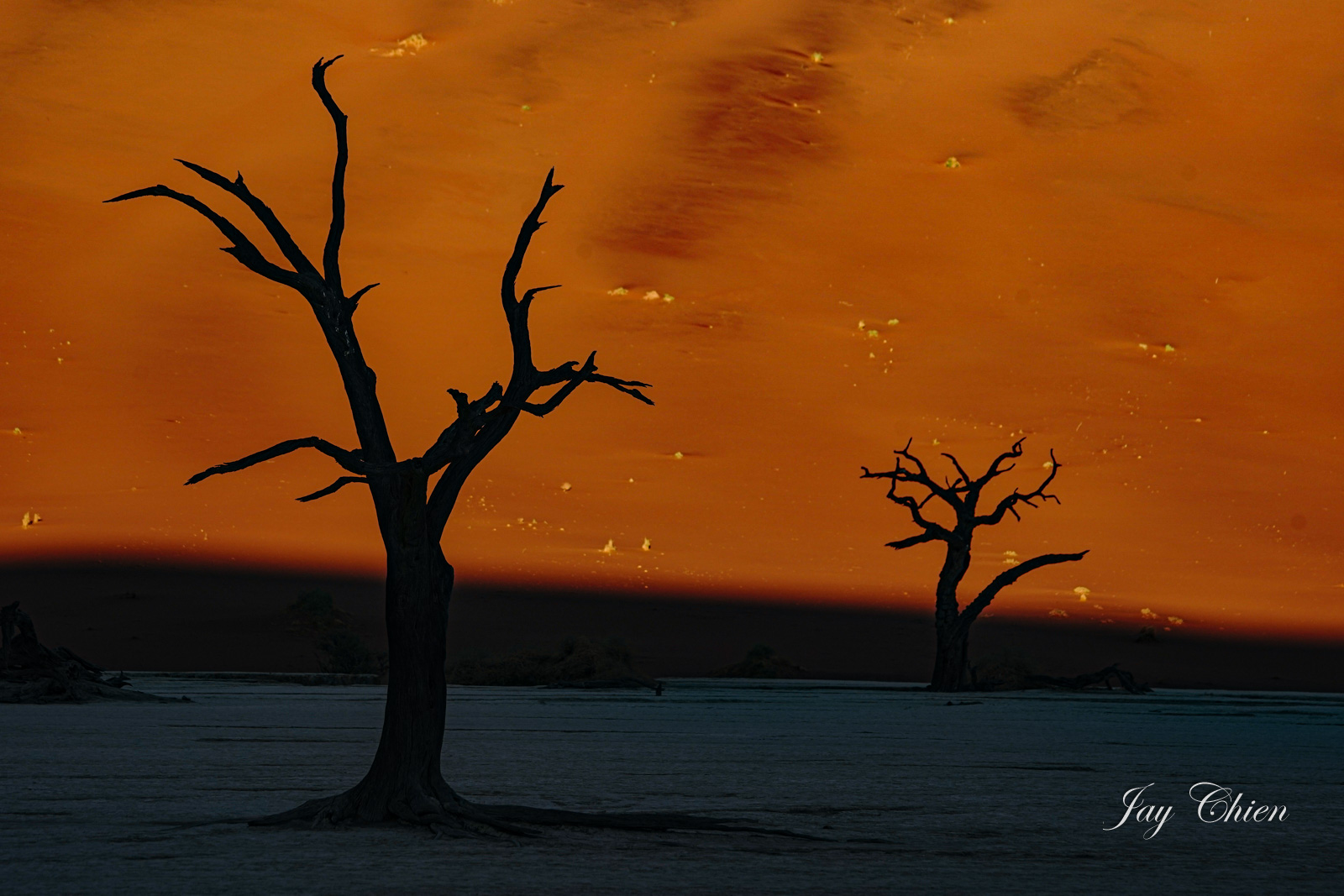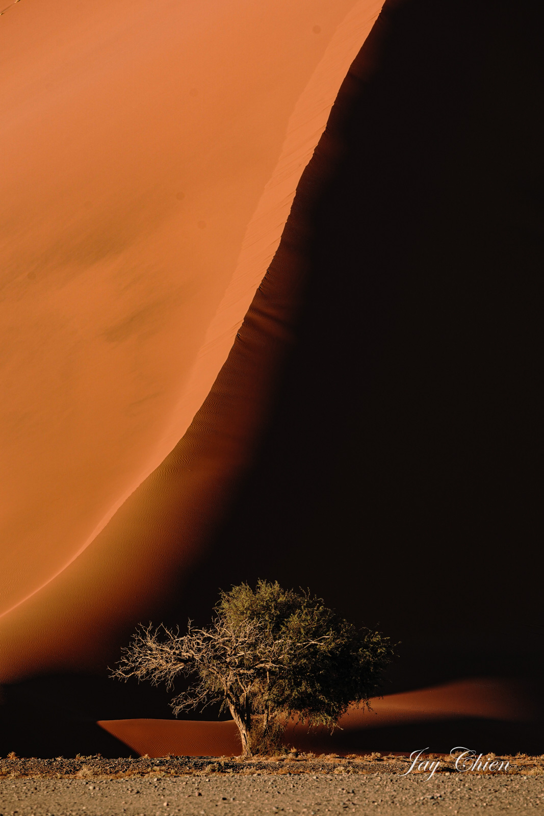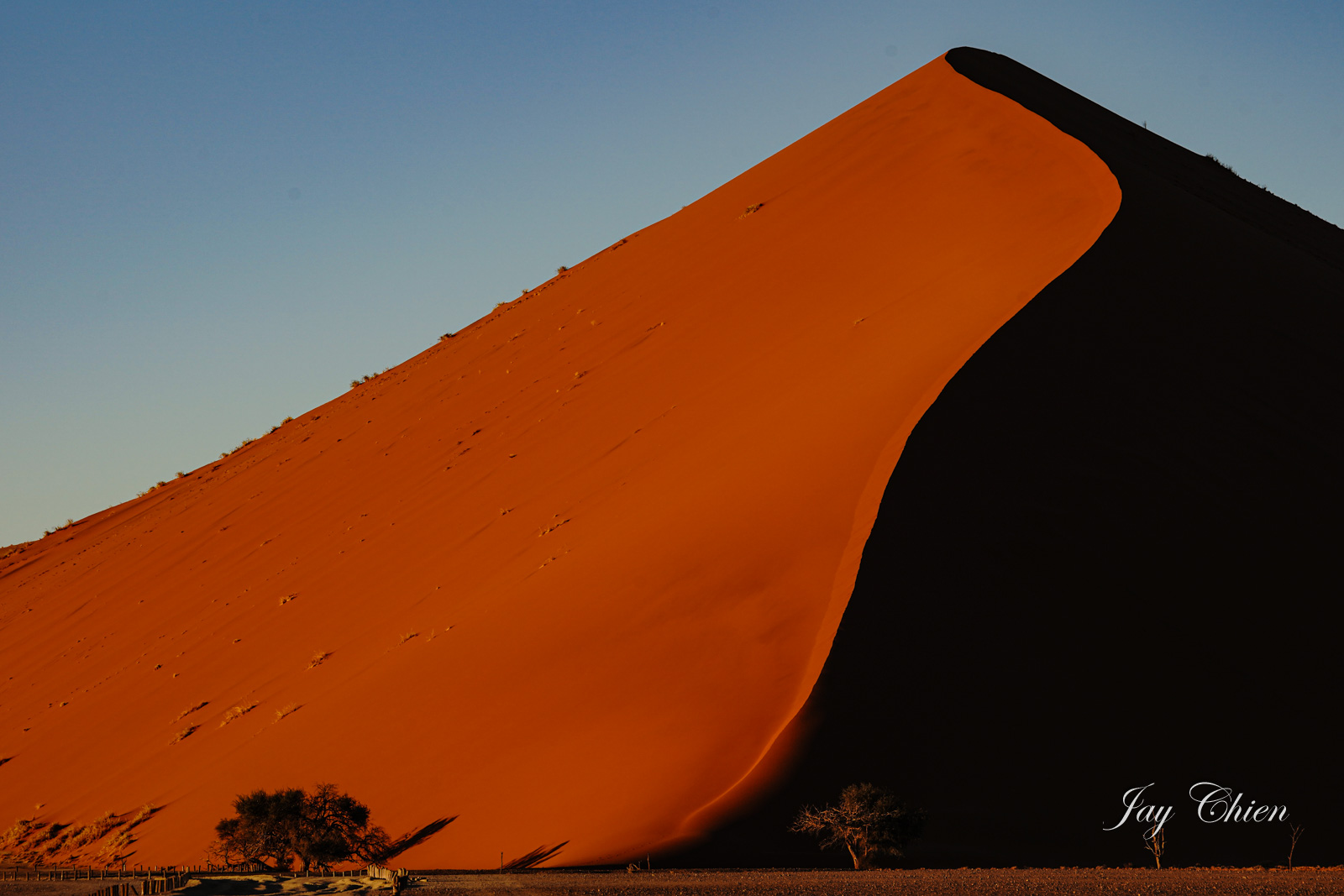40沙丘的日出, 我們到訪時40沙丘禁止攀爬, 也因此少了腳印的干擾, 日出日落時分沙丘在斜照下會產生一面通紅一面全黑的神奇光影, 前面的樹正好點綴了構圖