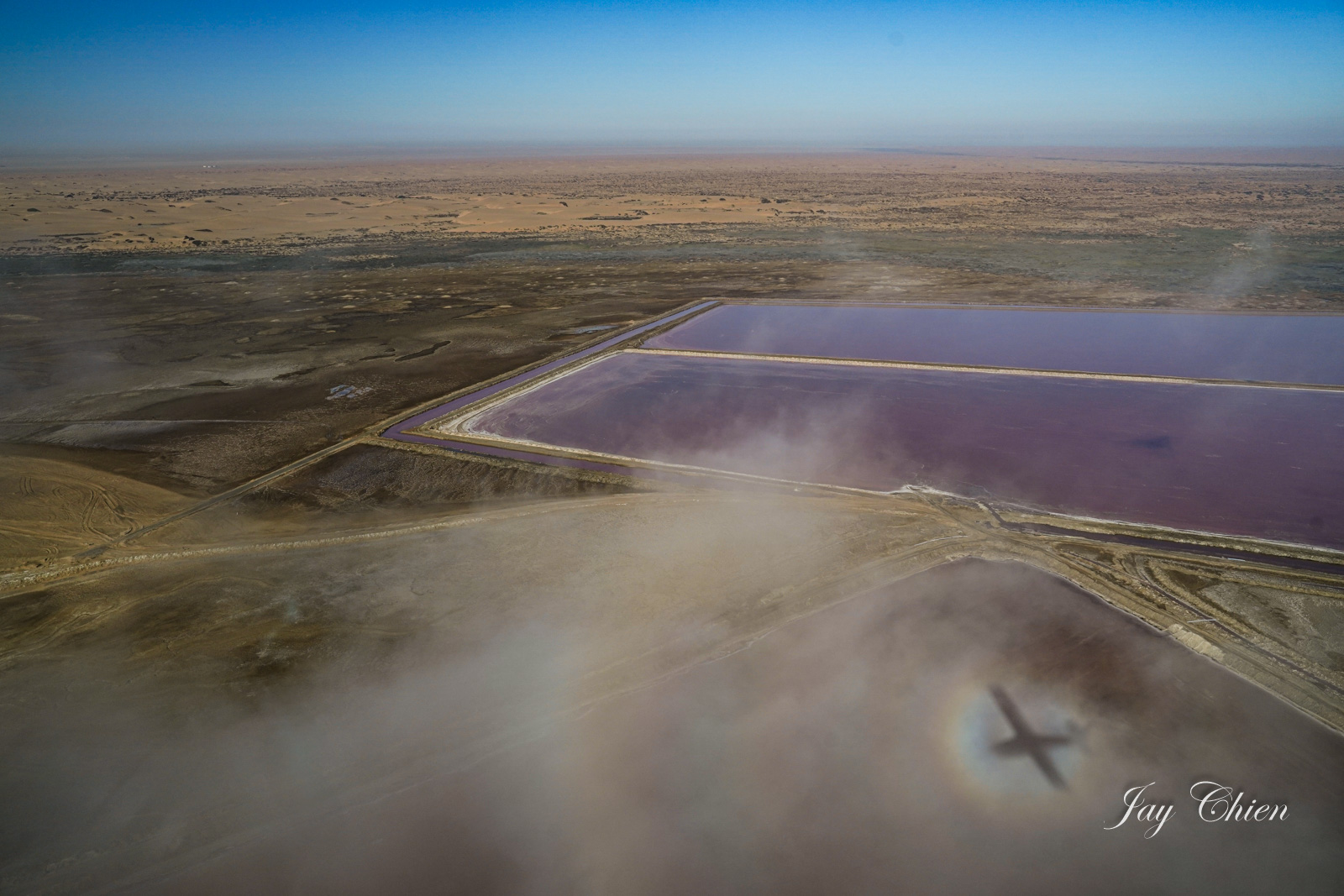 飛機鳥瞰粉紅鹽田以及沙海一線
