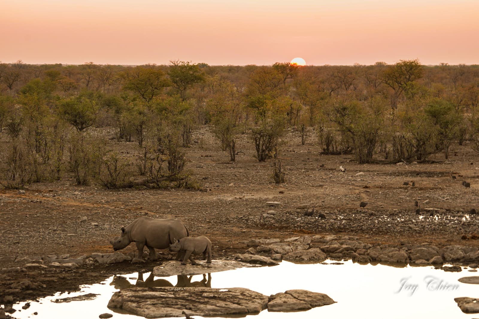 如果住宿在公園內, 日落時分或夜晚就可以到住宿地旁的水塘, 可以看到大象, 犀牛等來飲水, 加上夕陽光線, 非常賞心悅目