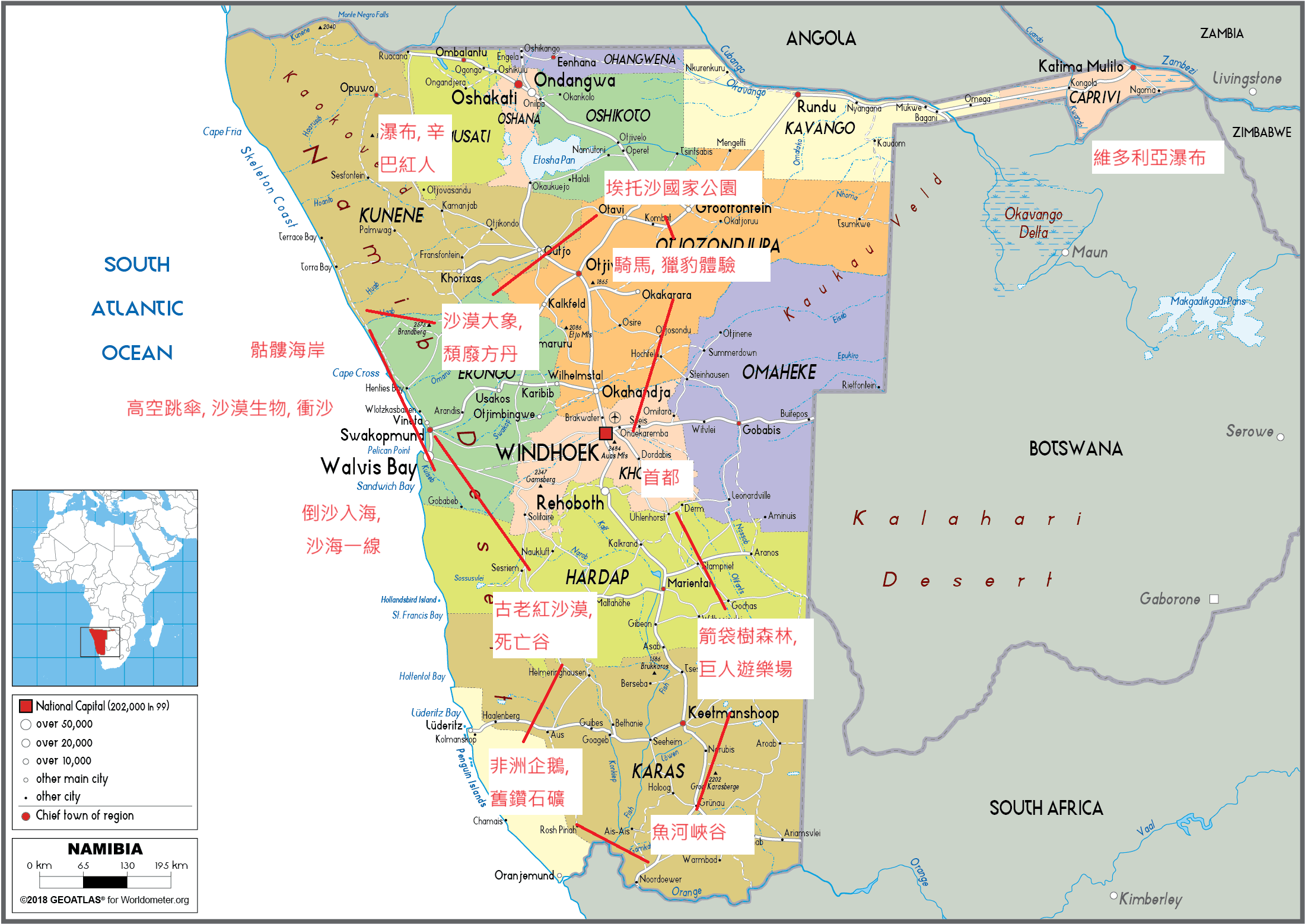 納米比亞, 位在非洲西南, 西臨大西洋, 北接尚比亞及安哥拉, 東接波札那, 南鄰南非. 面積82.5萬平方公里(比德州大13萬平方公里), 人口300萬(約相當於休士頓), 人口密度每平方公里2.5人, 世界倒數第二(僅高於蒙古), 經濟來源主要是農畜牧業, 鑽石以及旅遊業. 國內納米布沙漠佔據大部分國土, 沿岸有狹窄的平原以及荒無人煙的骷髏海岸, 以及世界上唯一沙漠海洋連接的沙海一線, 北部多草原, 棲息多種動物, 西北與安哥拉接壤處有埃普帕瀑布, 東北則是著名的維多利亞瀑布.