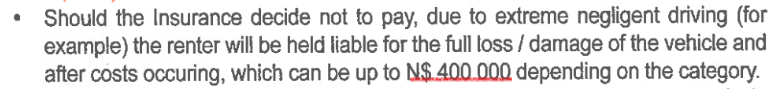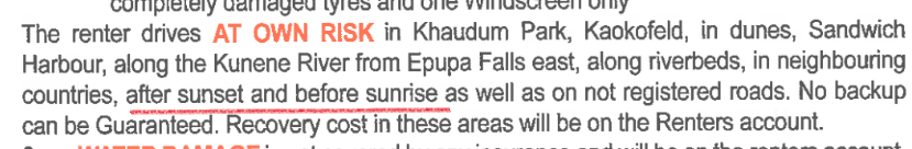 也不是不能開, 但是開車出事的話修理自付, 最高可到400000NAD (21843USD), 可以理解成夜間行車出事都是你的錯. 至於執行的話我也不清楚, 當然你可以等到早上再報給租車公司說撞了…