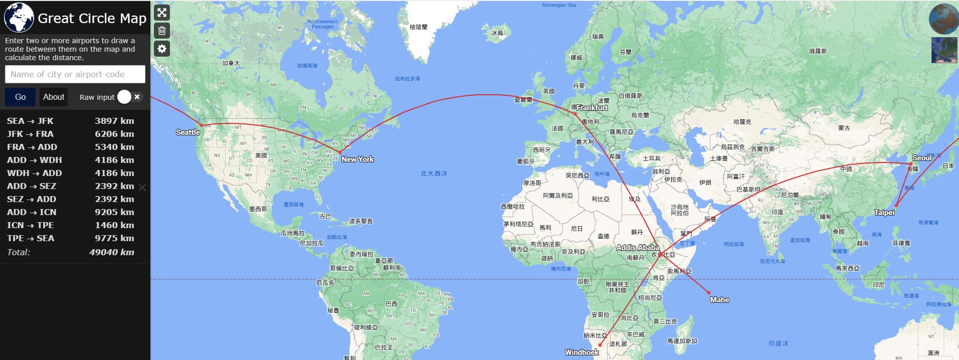 請問一下樓主,Google地圖上繪製飛行路線的那個圖是在哪個網站做的?我用Great Circle Mapper做不出這樣的效果。