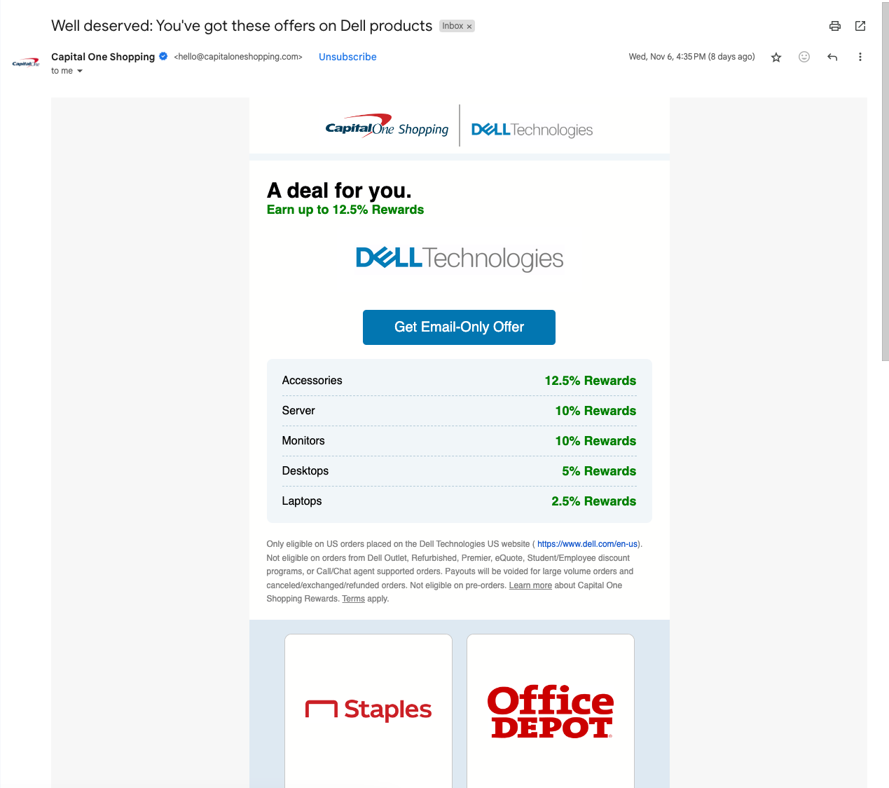 貌似很ymmv 感觉是c1 track你逛街的activity然后target 随后就给你发限时offer 我自己这几天挂着c1逛lenovo hp也刷出过几个13.5% 15% til end of this week的 但没刷到过walmart 这几天再试试