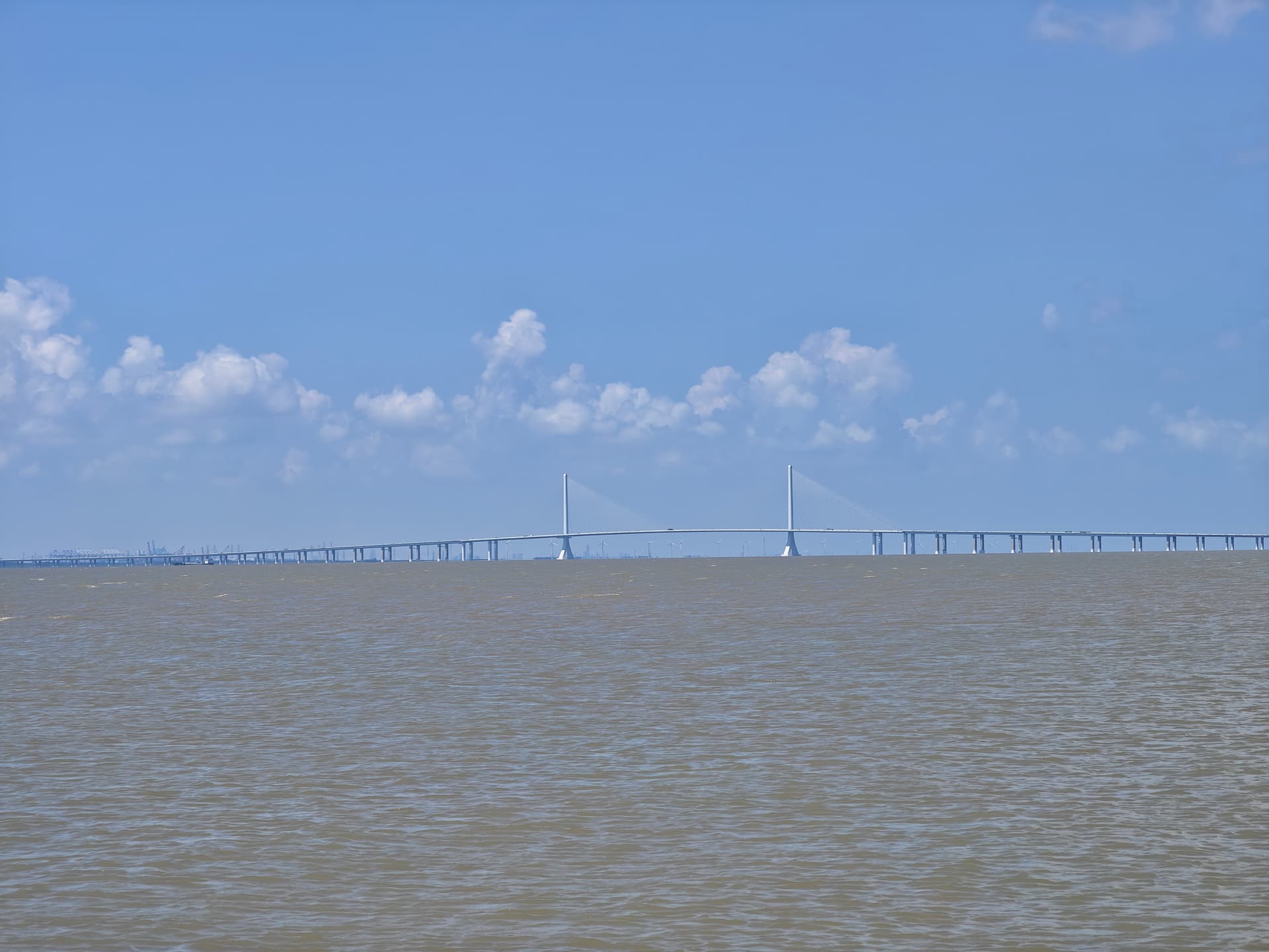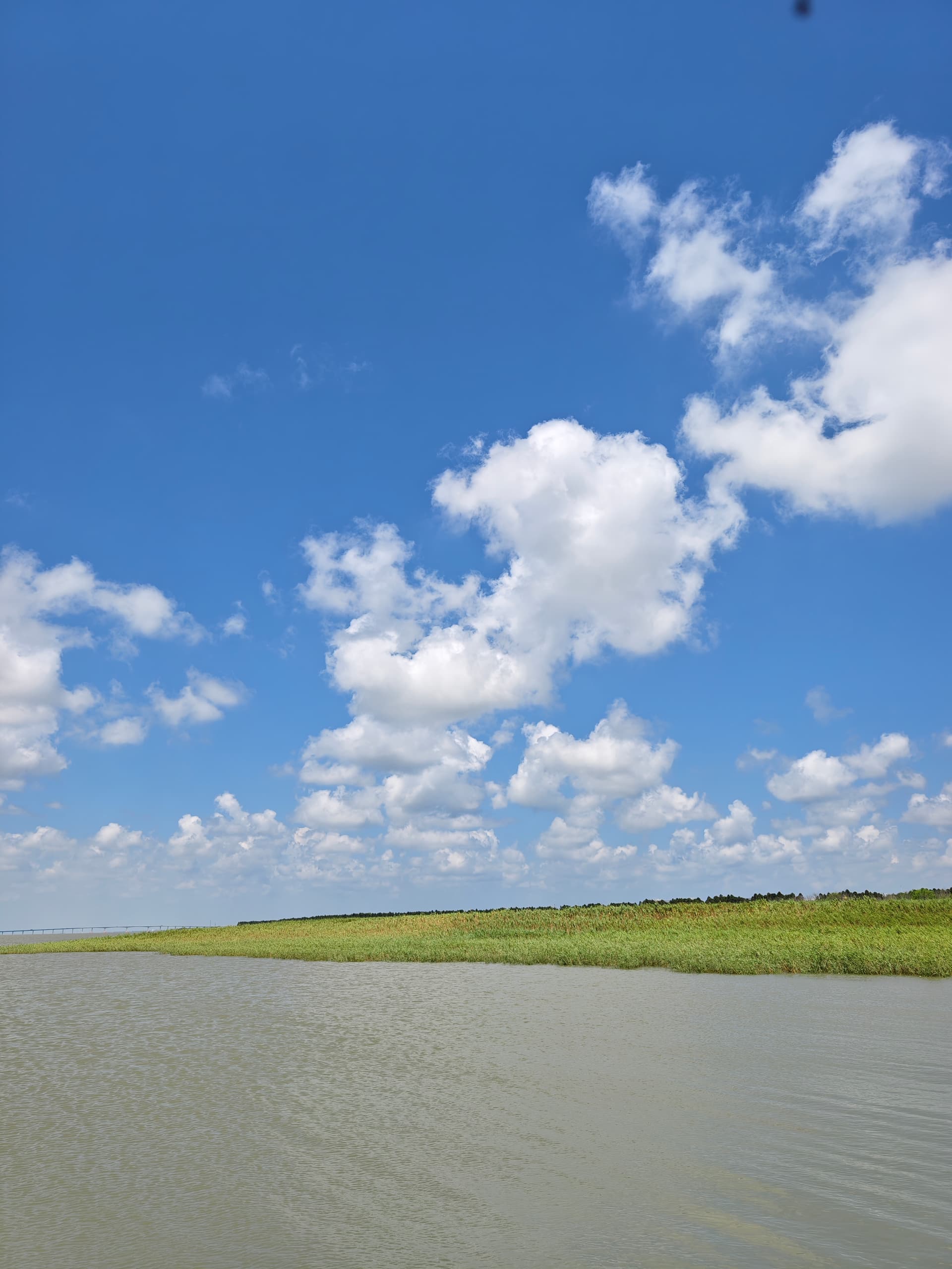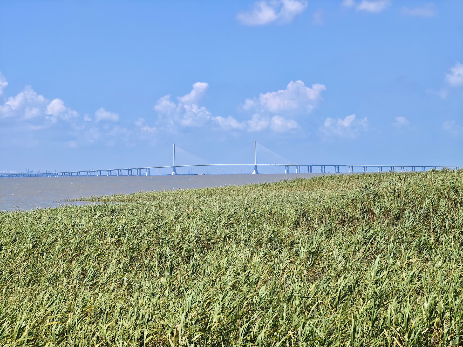 岛上/酒店附近空气质量不错,蓝天白云绿草地。长江口水天一色,此处十公里的江面(江对面是长兴岛,再往南才是上海浦东)一览无余:
