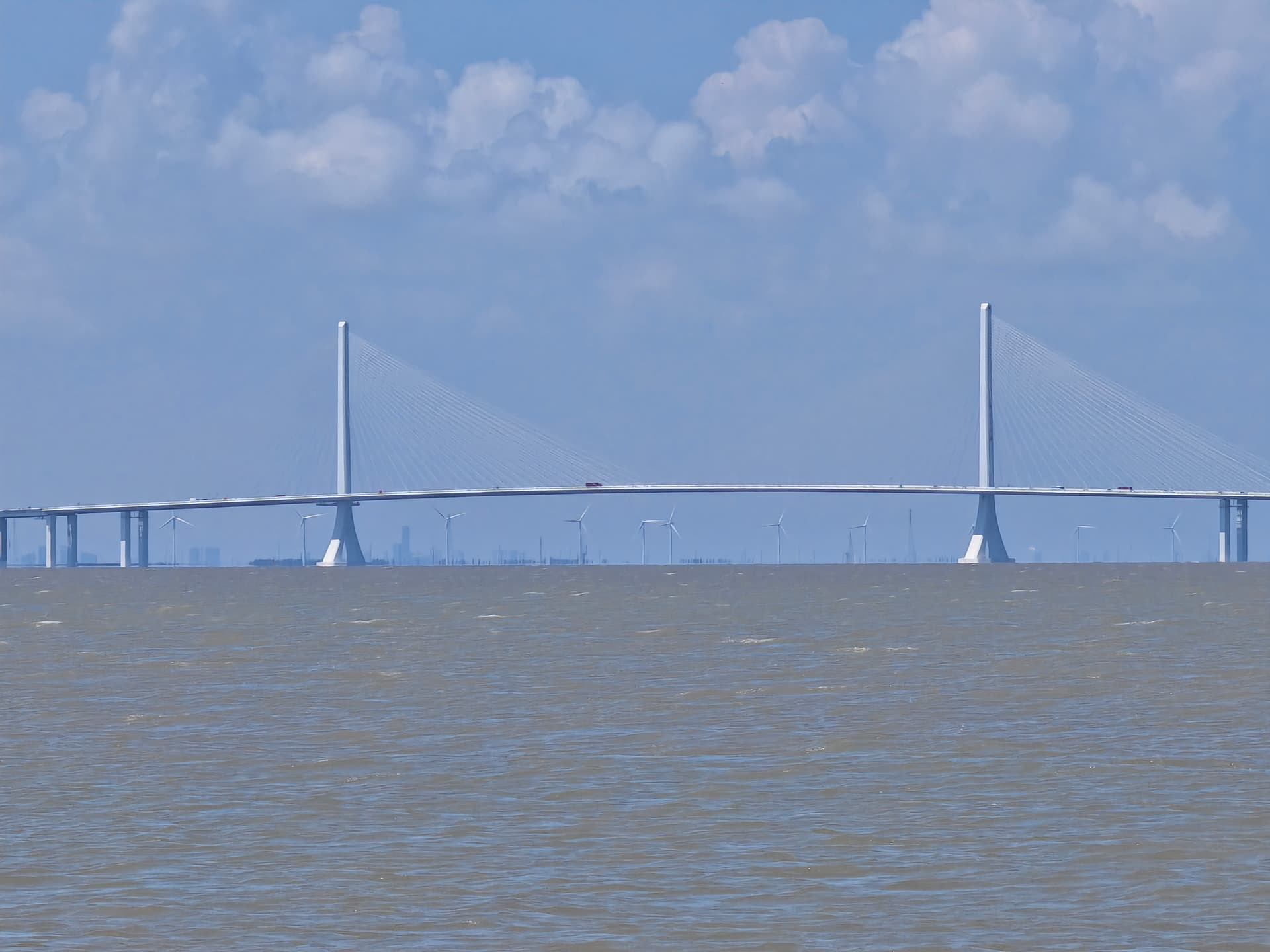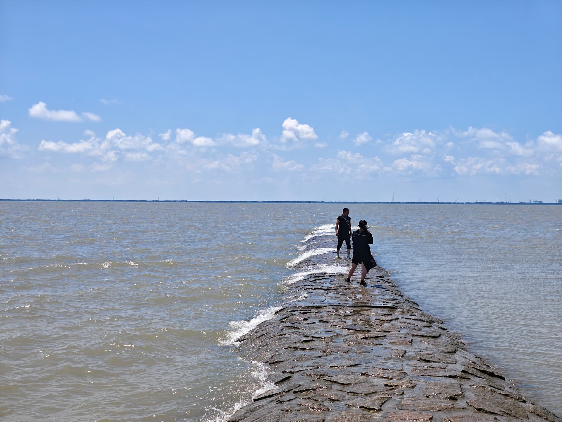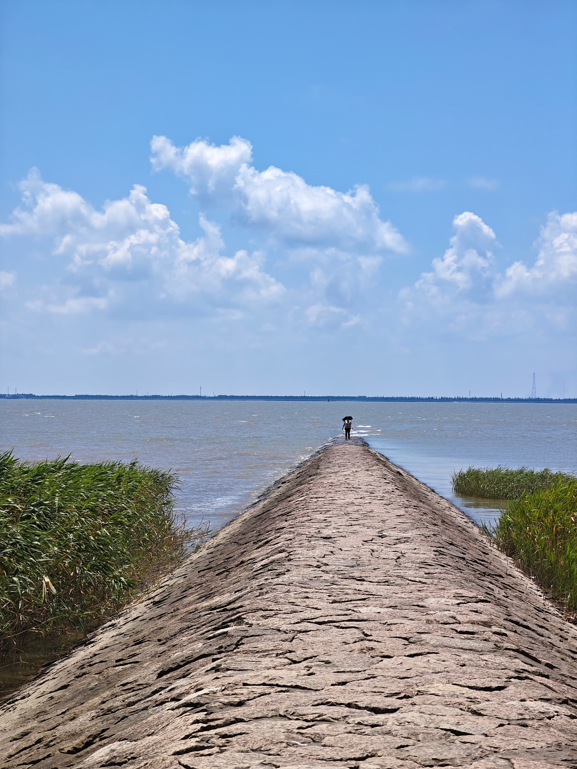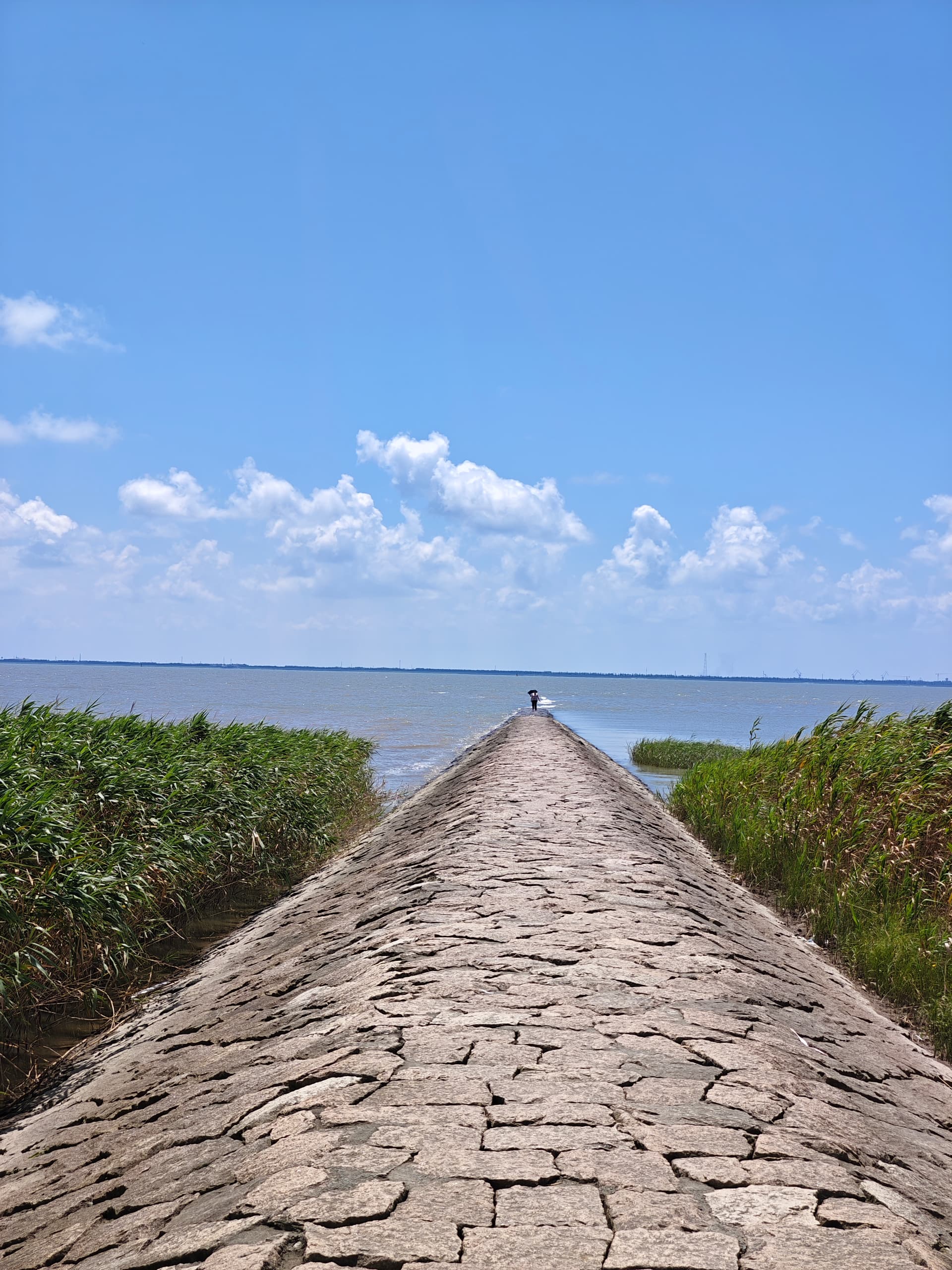 岛上/酒店附近空气质量不错,蓝天白云绿草地。长江口水天一色,此处十公里的江面(江对面是长兴岛,再往南才是上海浦东)一览无余: