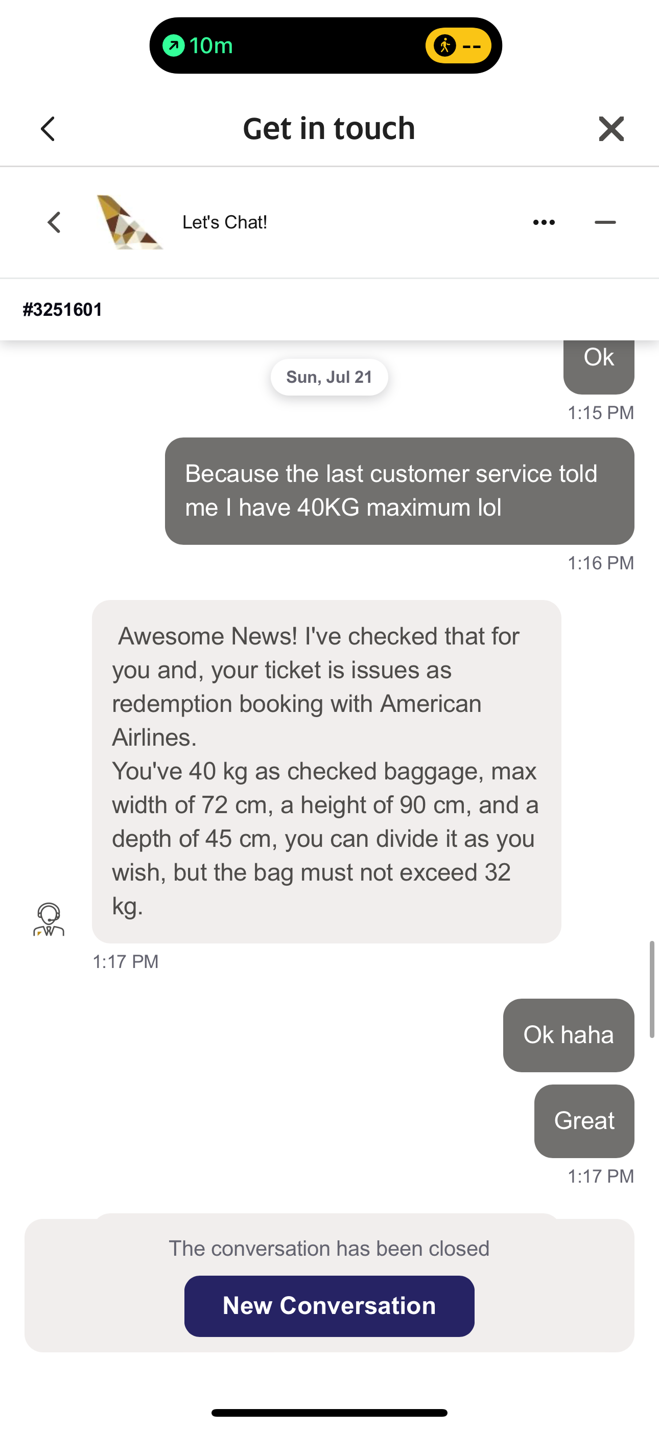 当时出票后aa上显示check in行李需要联系航空公司了解具体是多少 于是在阿提哈德app里面联系在线客服