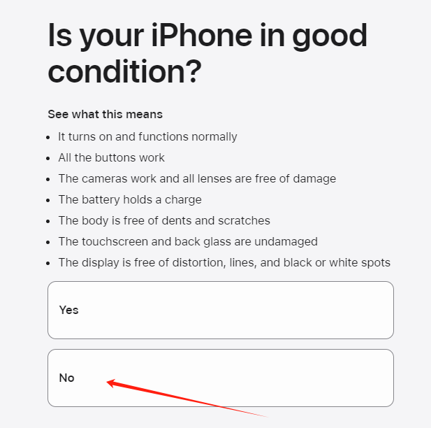 备注:在官网Trade-in页面,只要能开机,屏幕能亮,无外部损坏,Condition选No也显示全价回收。