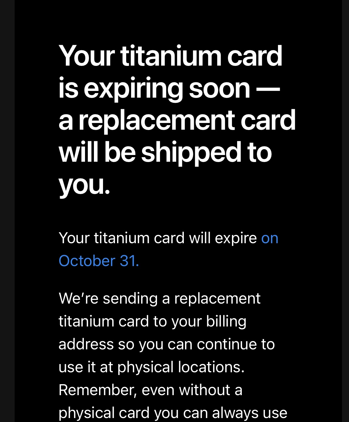 你去 Wallet 里可以看到你现在实体卡的有效期(跟虚拟卡的有效期不一样)。新的实体卡有效期更长了