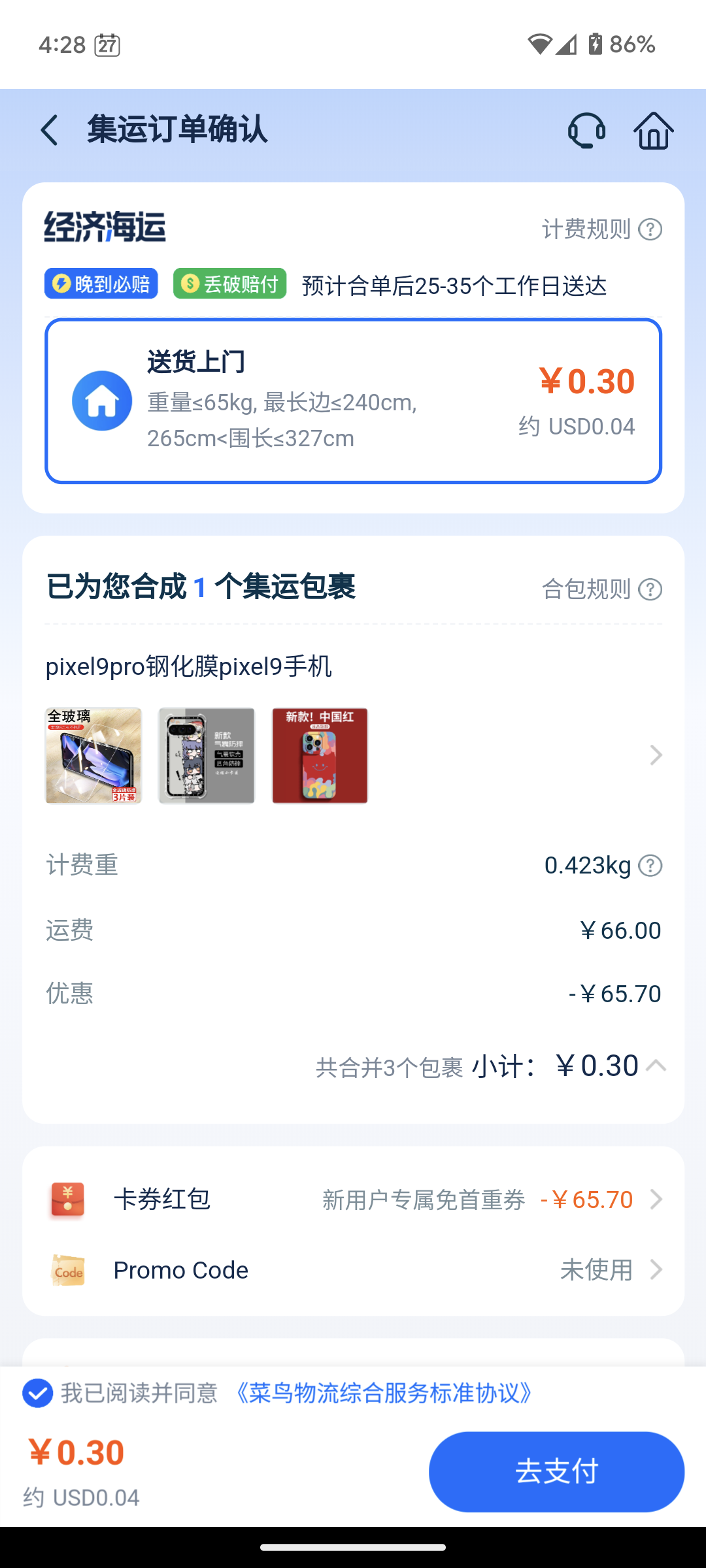 我大概是十几天前注册菜鸟的app的,那时候只有新人一张的空运券,然后有一天不小心登录app看到的这个活动。我当时简直不敢置信,再三跟客服确认了以后,下了几个便宜的手机壳(没错,就是配合隔壁贴刚撸的iPhone 12和pixel 9用的手机壳),然后尝试点击合并下单,看到最终收费为0.3r,诚不欺我,我这才敢往泥潭上发给家人们。