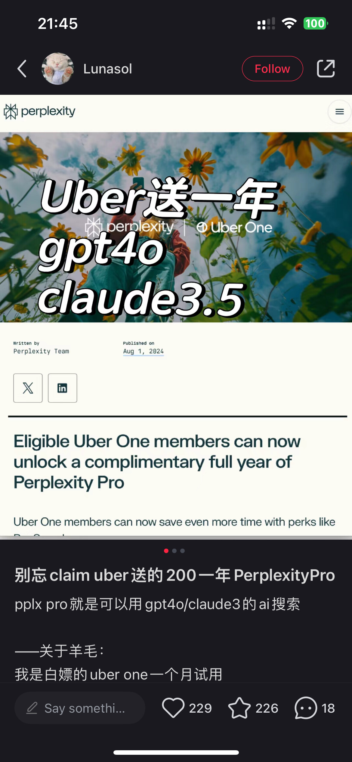 我是试用期的uber one,点开offer发现并没有给perplexity的code ![]()