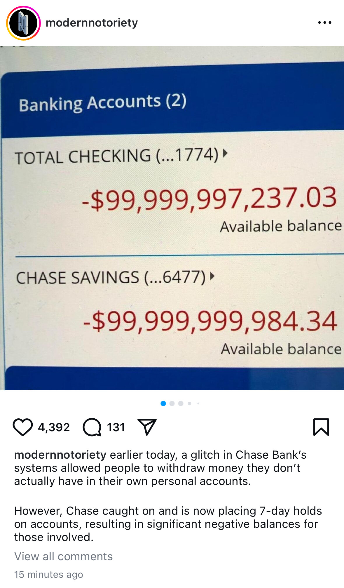 Apparently, a glitch in Chase Bank’s systems has allowed people to withdraw money they don’t actually have.