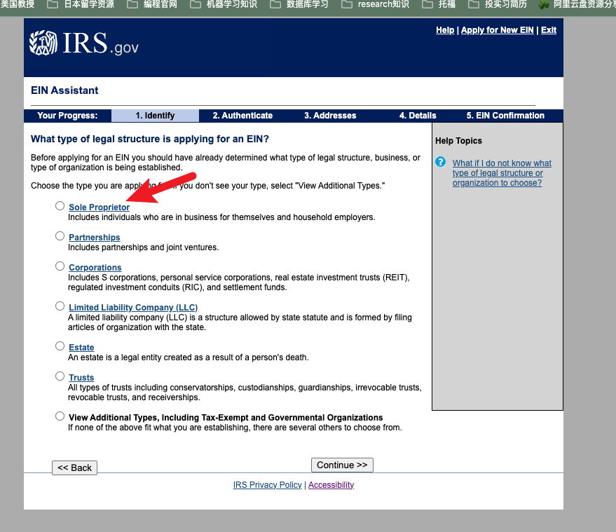 - 如果不想创建个公司,就去IRS弄个Sole Proprietorship申请EIN,进入IRS官网:IRS,点击apply online,然后会跳出以下页面: